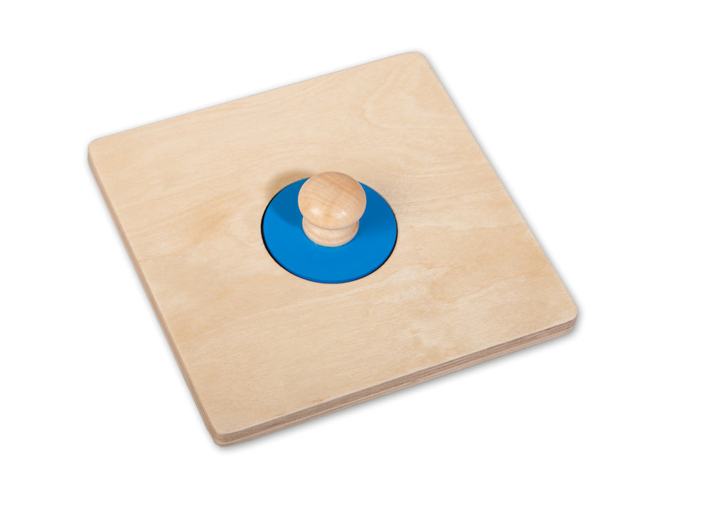 A simple wooden puzzle with a small circle inset. Lovely chunky wooden handle. Once the child can complete one puzzle add in additional shapes.
