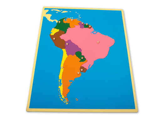 A map of South America with removable puzzle pieces that represent the countries. Gettman describes how this equipment is used in Basic Montessori.
