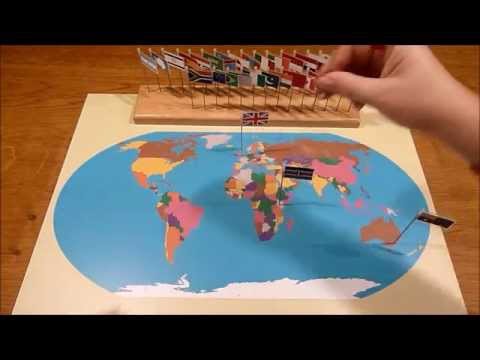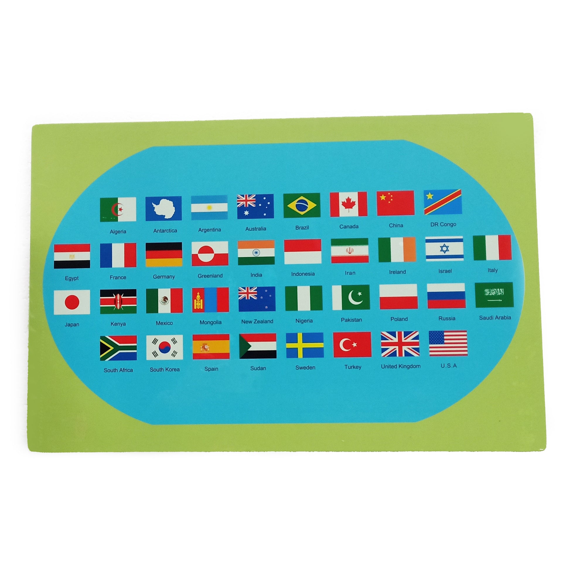 An accurate world map with 36 plastic flags in a wooden stand. The flags peg into the map in the position of the capital cities of the 36 significant countries. The flags are named on the reverse of the board.