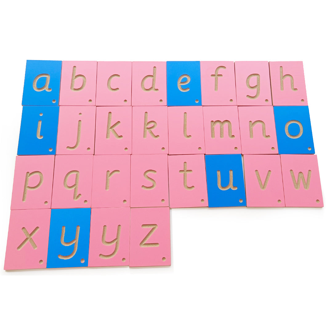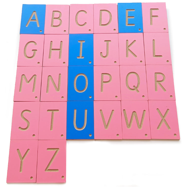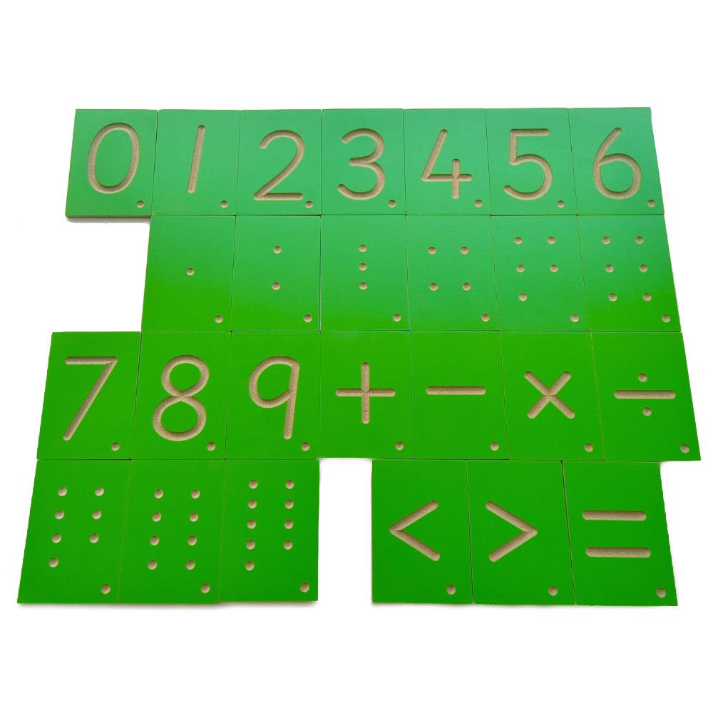 Tactile letters with numbers and mathematical signs on green, consonants on pink and vowels on blue wooden boards. Each character is grooved out of the board to make an easily traceable shape for the finger or with a stylus for early pencil control. These letters and numbers represent excellent value for money.