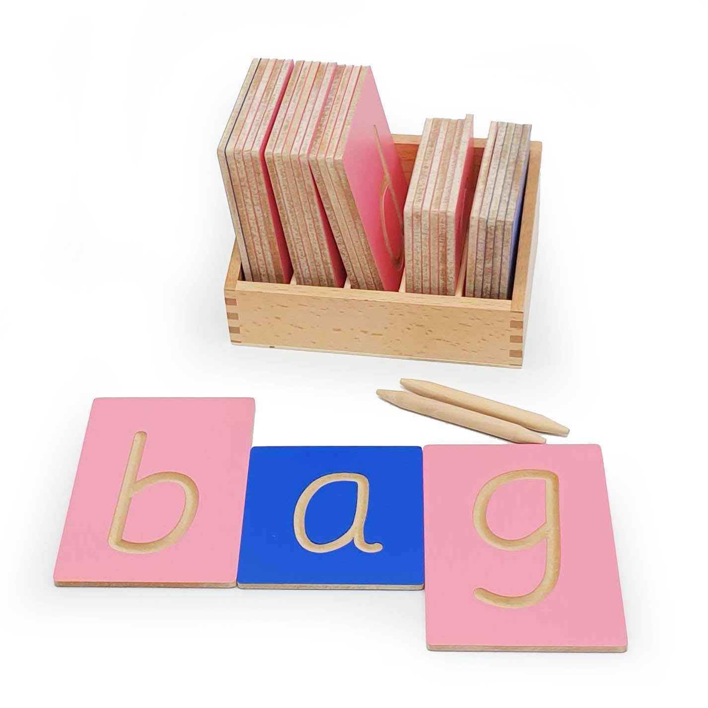 Tactile grooved Sassoon font letters with a stylus and wooden box, consonants on pink and vowels on blue boards. Each character is grooved out of the board to make an easily traceable shape for the finger or with a stylus for early pencil control.