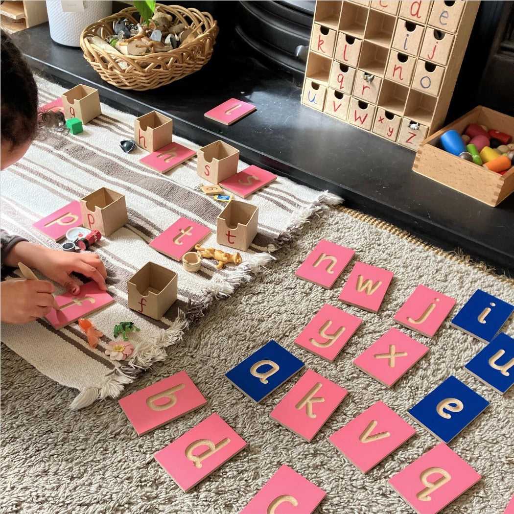 Tactile grooved Sassoon font letters with a stylus and wooden box with a shallow sand tray, consonants on pink and vowels on blue boards. Each character is grooved out of the board to make an easily traceable shape for the finger or with a stylus for early pencil control.
