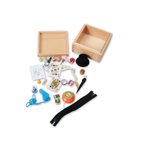 The objects will fit into the compartments of our small moveable alphabet box, although the lid may not fit back on.