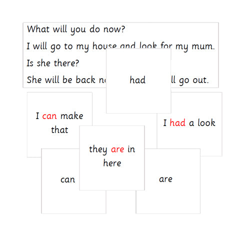 A .pdf card file, that will be emailed to you for you to print yourself, to make a set of the 100 most frequently used words with the word in a phrase on the reverse of each card (if printed 2-sided).  There is also a set of sentences using over half of the words for further reading practice.