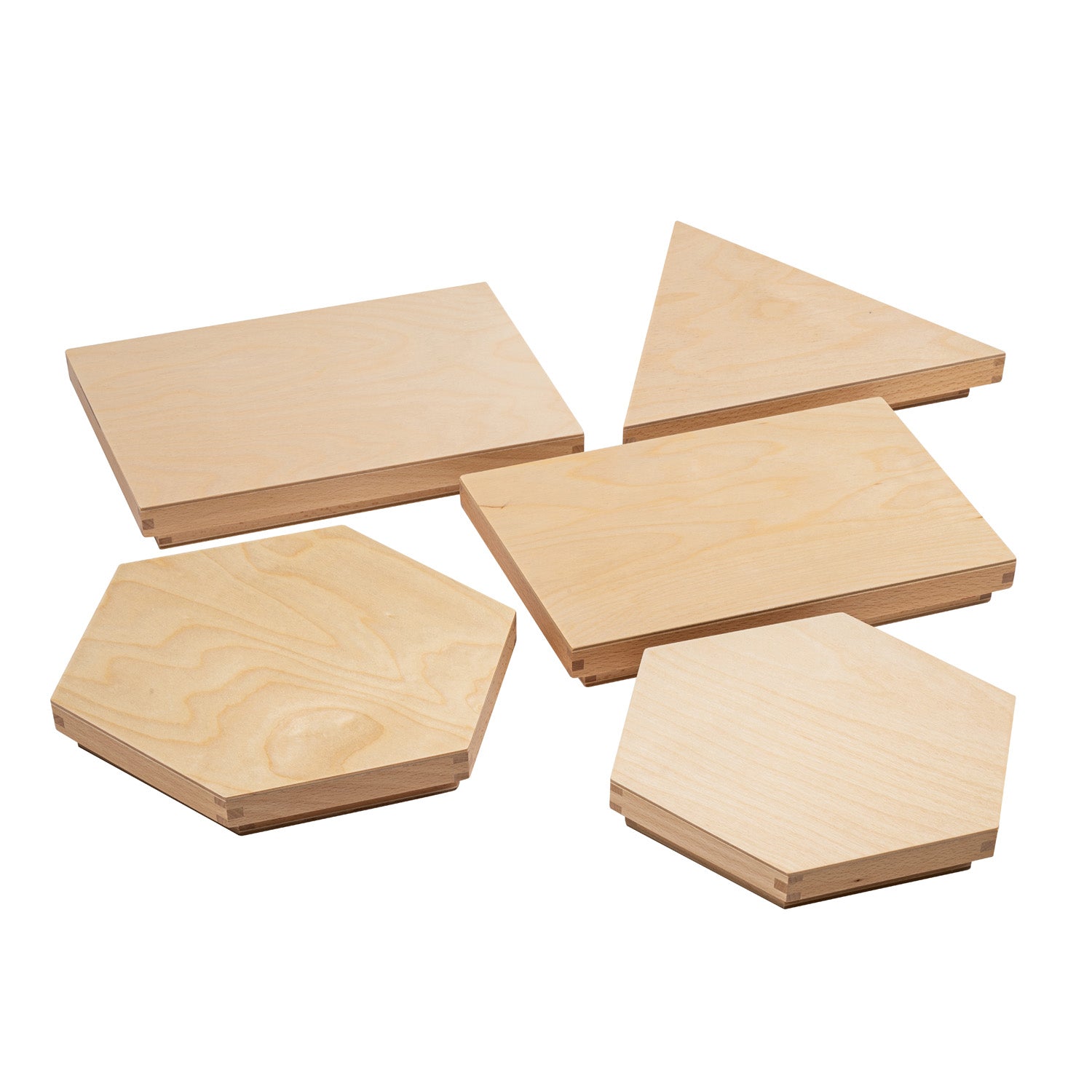 The Constructive Triangles give the child practical experience in plane geometry. The set consists of: 2 rectangular boxes, 1 triangular box, 1 small hexagonal box, and 1 large hexagonal box, each containing triangles of differing size, shape and colour.