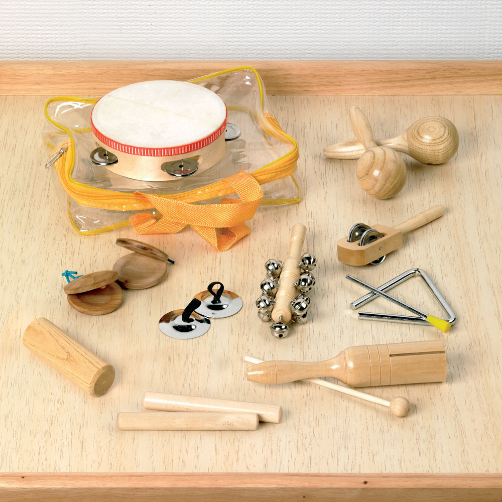 Set of 10 percussion instruments in handy clear plastic carry case. Contains - a pair of maracas, a pair of castanets, tambourine, triangle and beater, pair of claves, rhythm-clapper, single tone guiro and beater, a pair of finger cymbals, wooden shaker pot and 13 bell jingle stick.