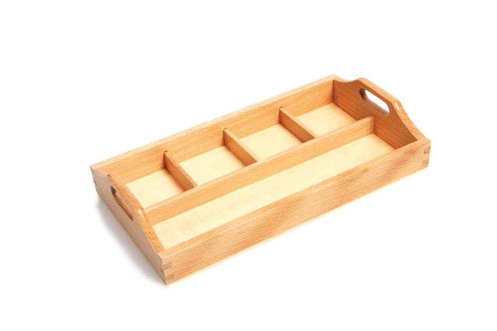Ideal for practical life sorting activities: a small tray with one long section 235x55mm and 4 smaller compartments 55x55mm.