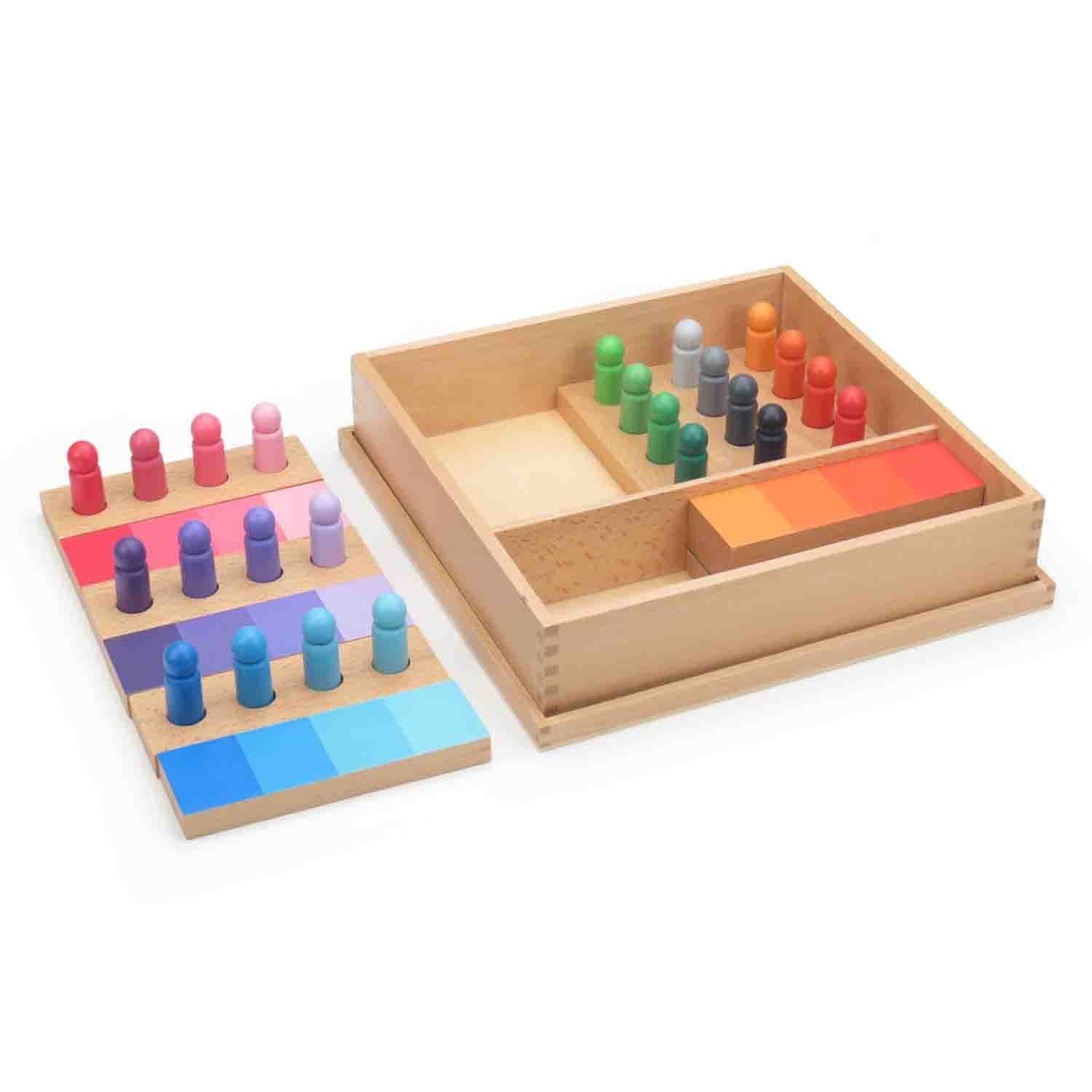 A Montessori style game where the child matches 4 coloured skittles to a control board in shades of 6 colours: