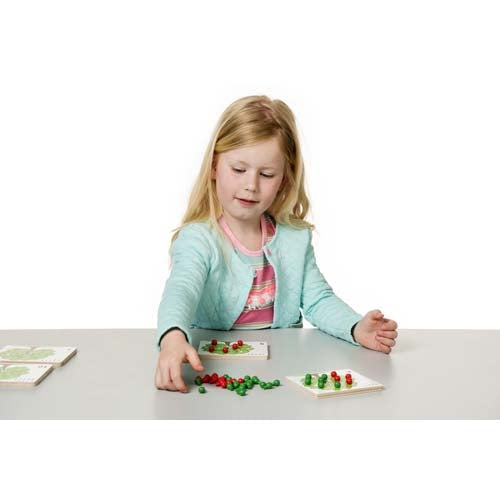 Remplissez les arbres avec autant des pommes rouges indiquées, avec des points et un symbole numérique. Complétez les arbres avec des pommes vertes. Développer l’ajout des chiffres jusqu’à 10 et de la motricité fine.