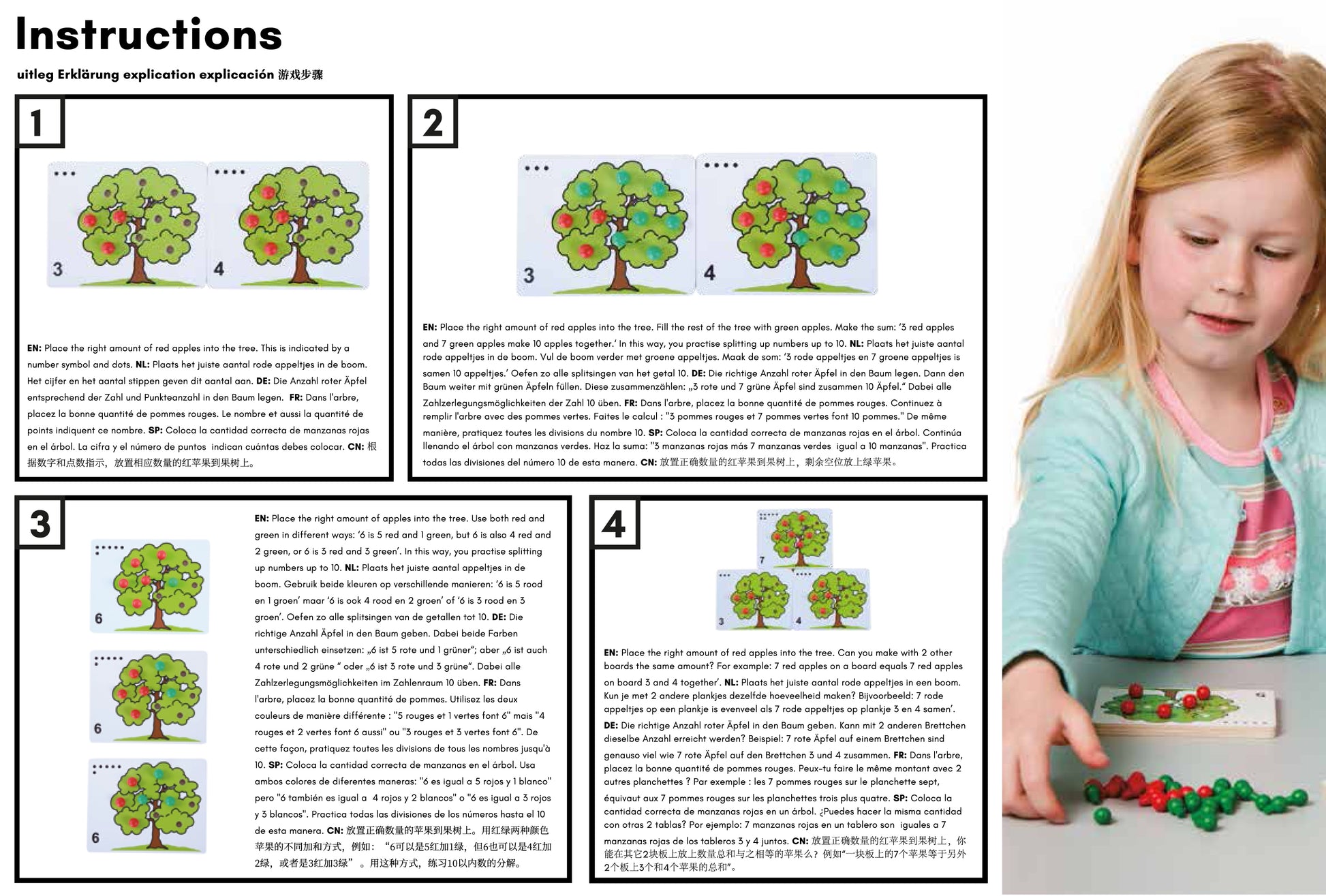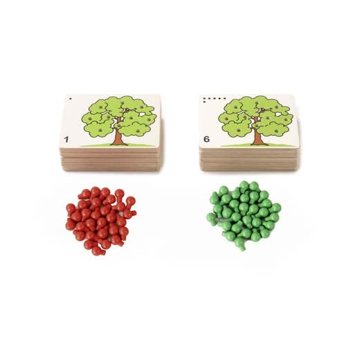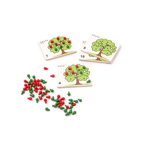 Fill trees with the amount of red apples, indicated by a number symbol and dots. Complete trees with green apples up to 10. Understand number bonds to ten. Develop fine motor skills.