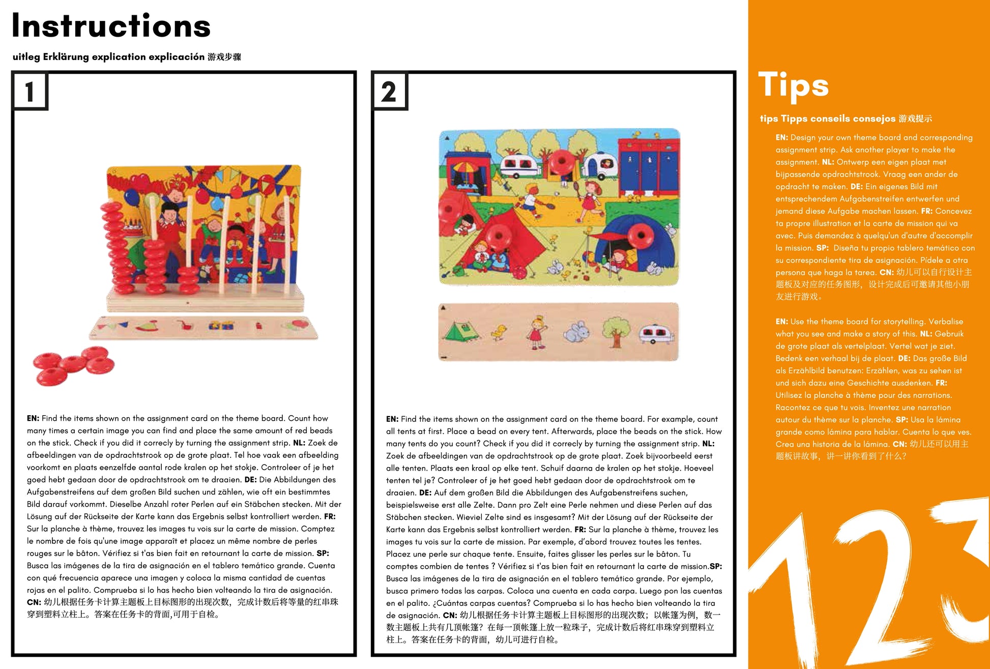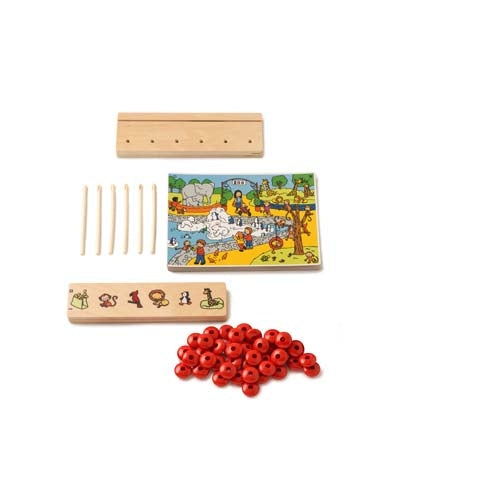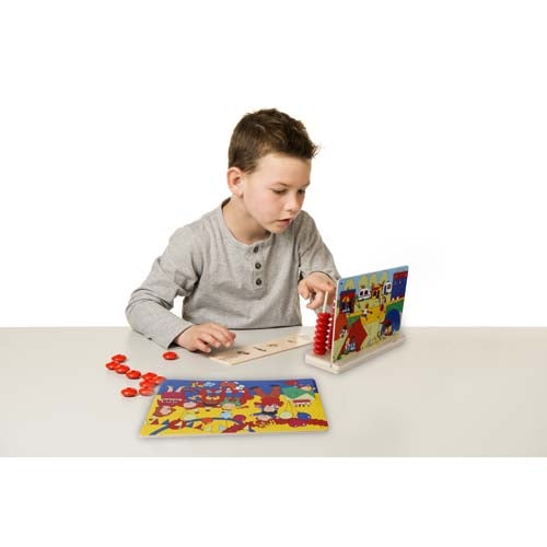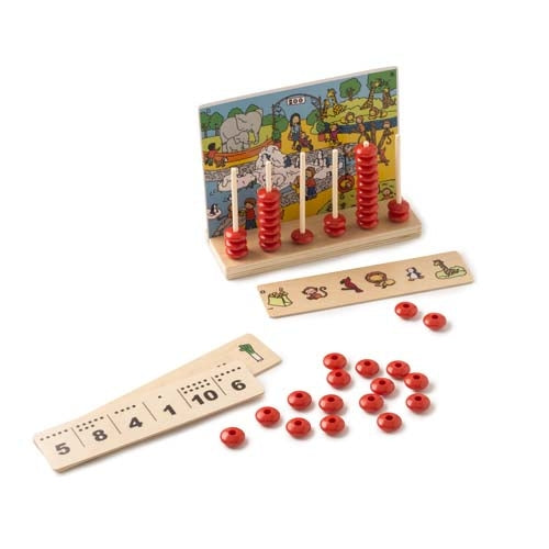 Search for assignment strip items on the theme boards. For each item found, place a bead on the stand. Flip the assignment strip over for the answers, shown in both dots and numbers. Stimulate counting and number sense up to 10.