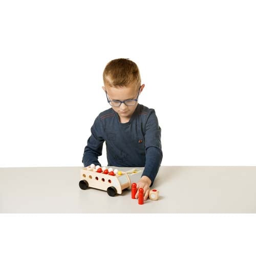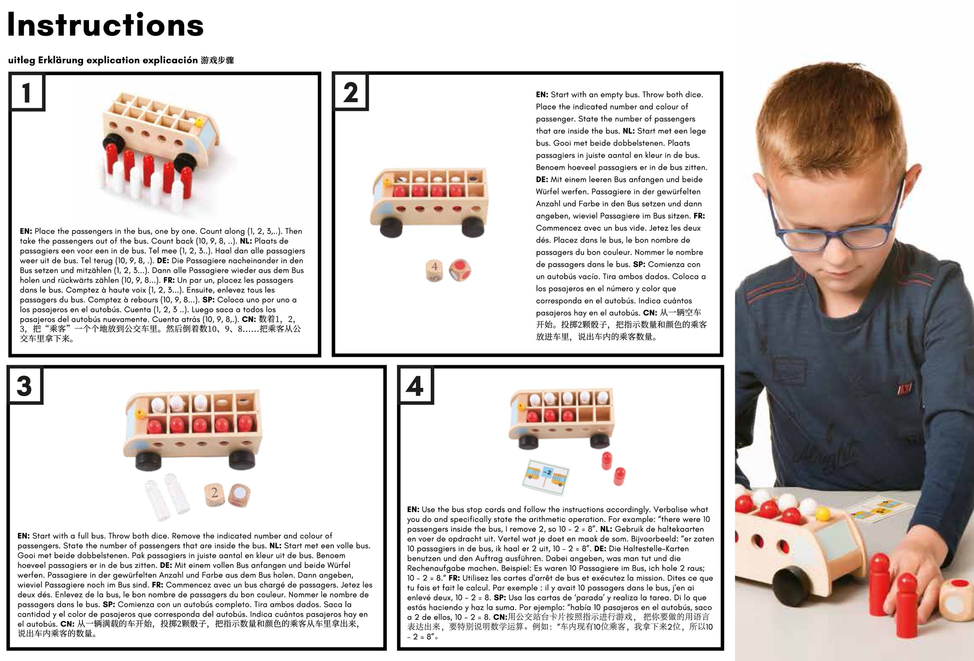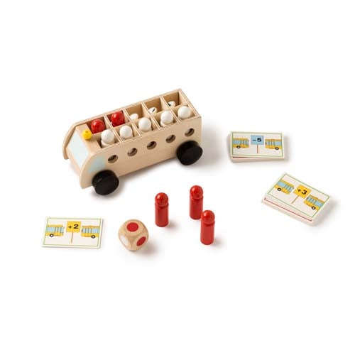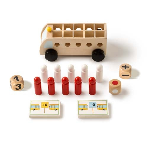 Let passengers get on or off the bus to practise math skills. How many passengers take a ride with the bus? Introduce counting, adding and subtracting up to 10.