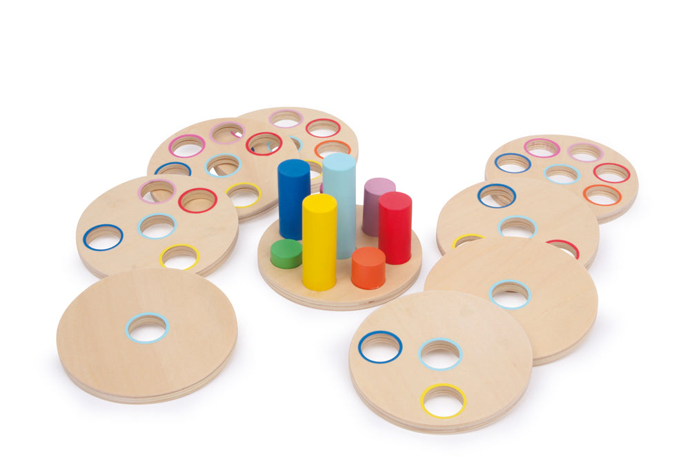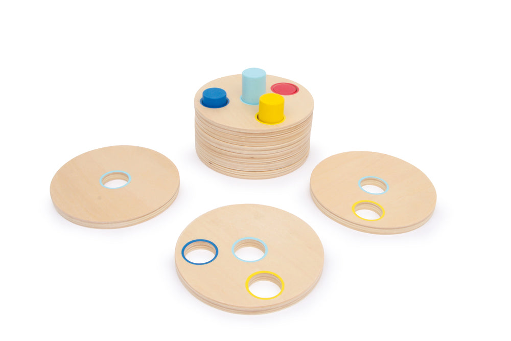Can be played with the coloured rings showing or hidden for added difficulty. Can be used by one child or in turns as a game.