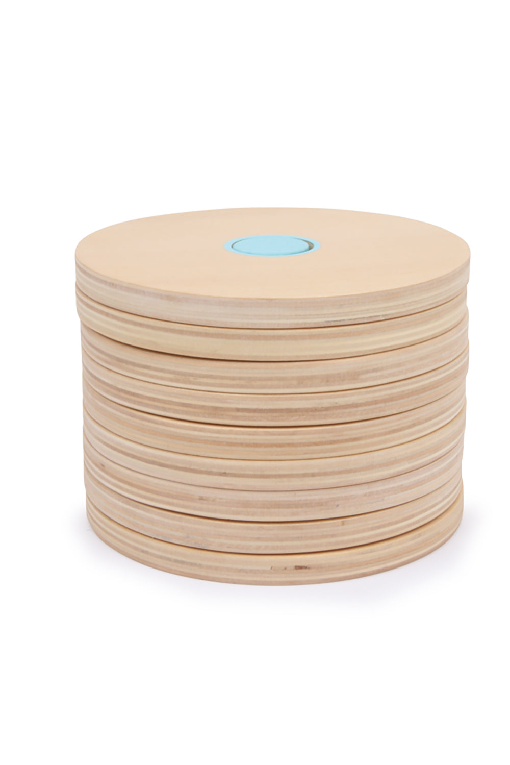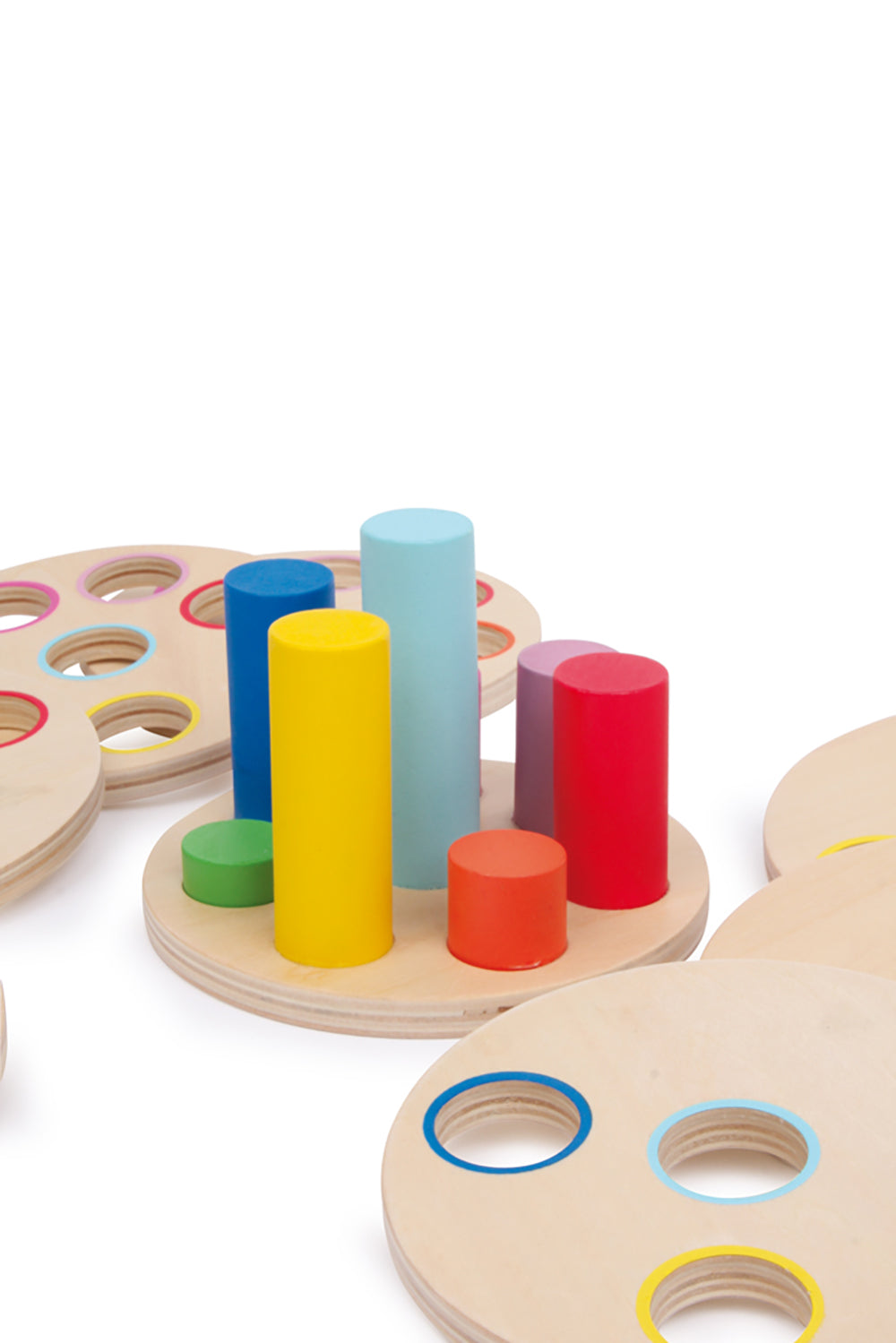 A logic puzzle where the child places the 8 discs in the correct order on the coloured posts.