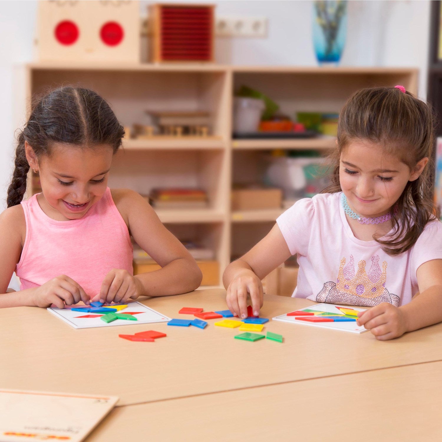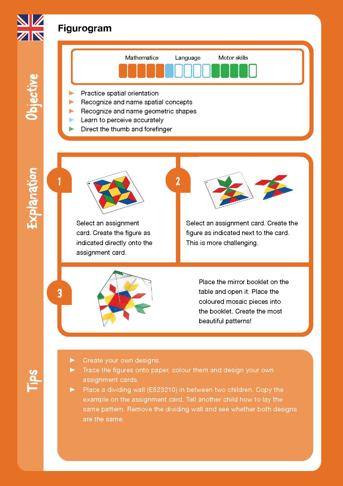 Figurogram. Promote abstract thinking and creativity with this fascinating activity. Create the geometric image by following assignment cards. For a challenging game, recreate one quarter of an image which is completed when reflected in the mirrors. Shape, pattern and spatial relationships take a new perspective. The assignment cards have an increase in degree of difficulty.