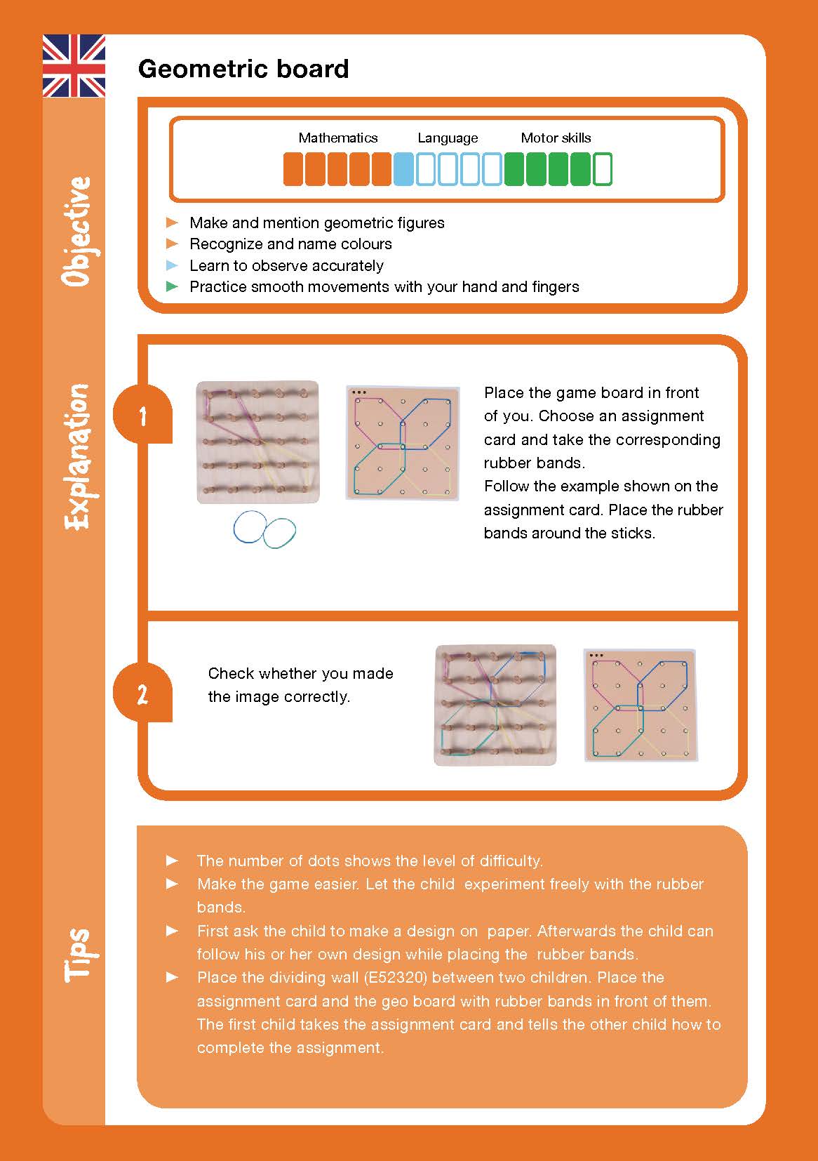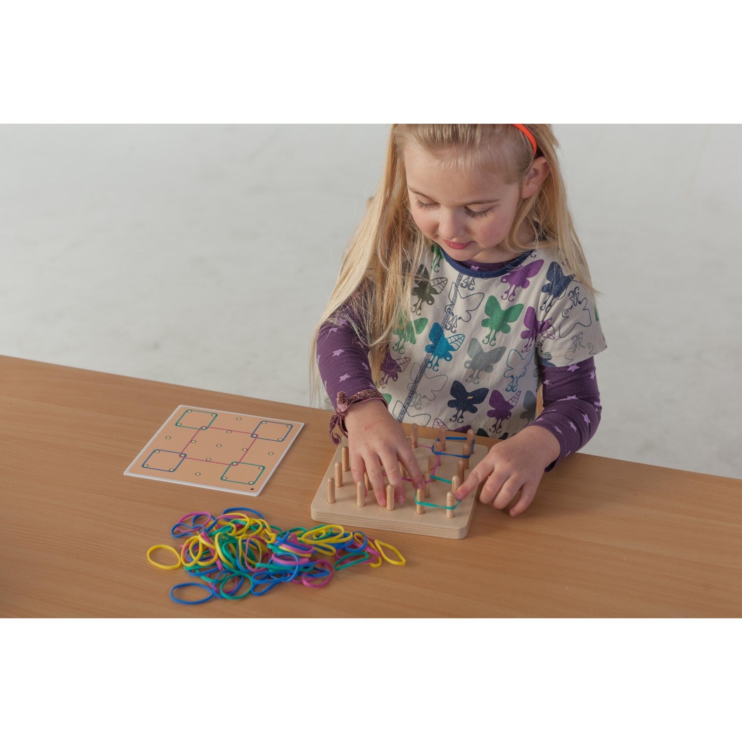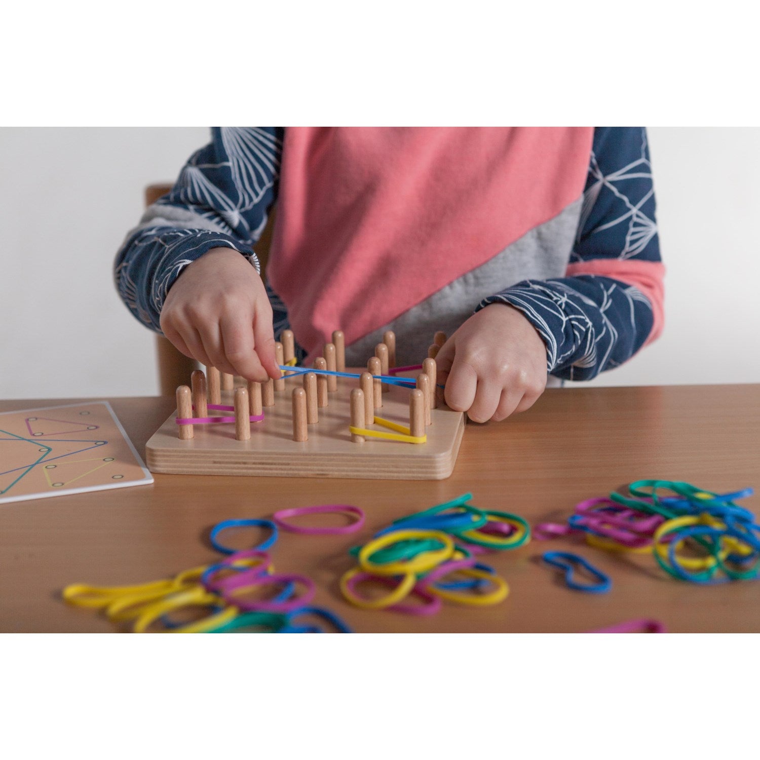 Create shapes by placing the rubber bands around the pins. Discover perimeter, surface area, different angles and much more. Use the example cards or create beautiful creations yourself.