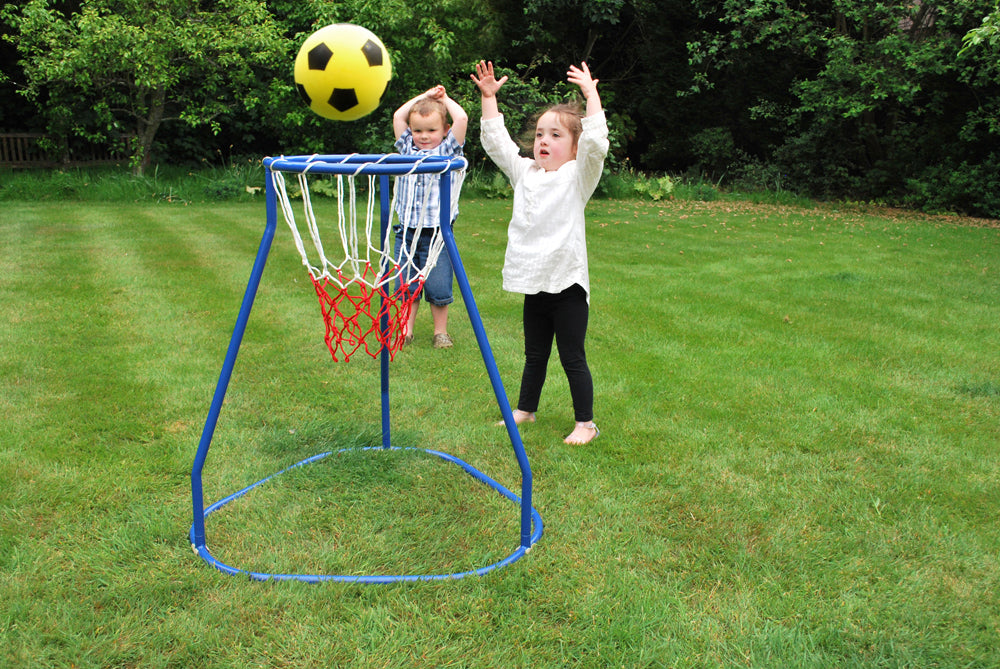 Free standing basketball hoop made from tubular steel with a nylon rope net.
