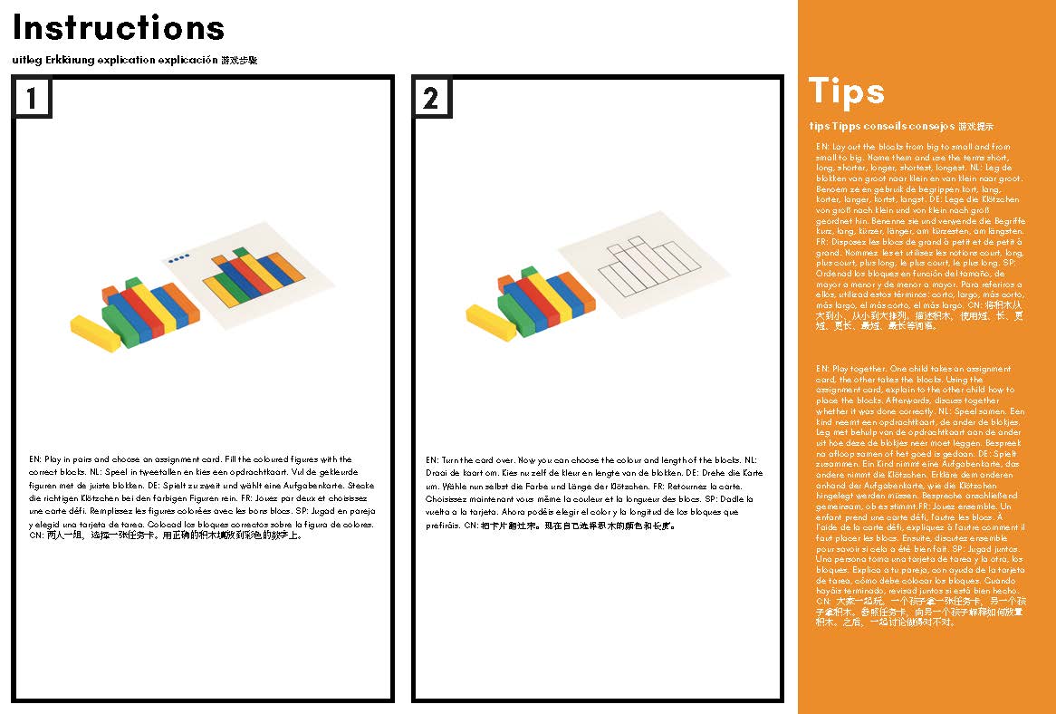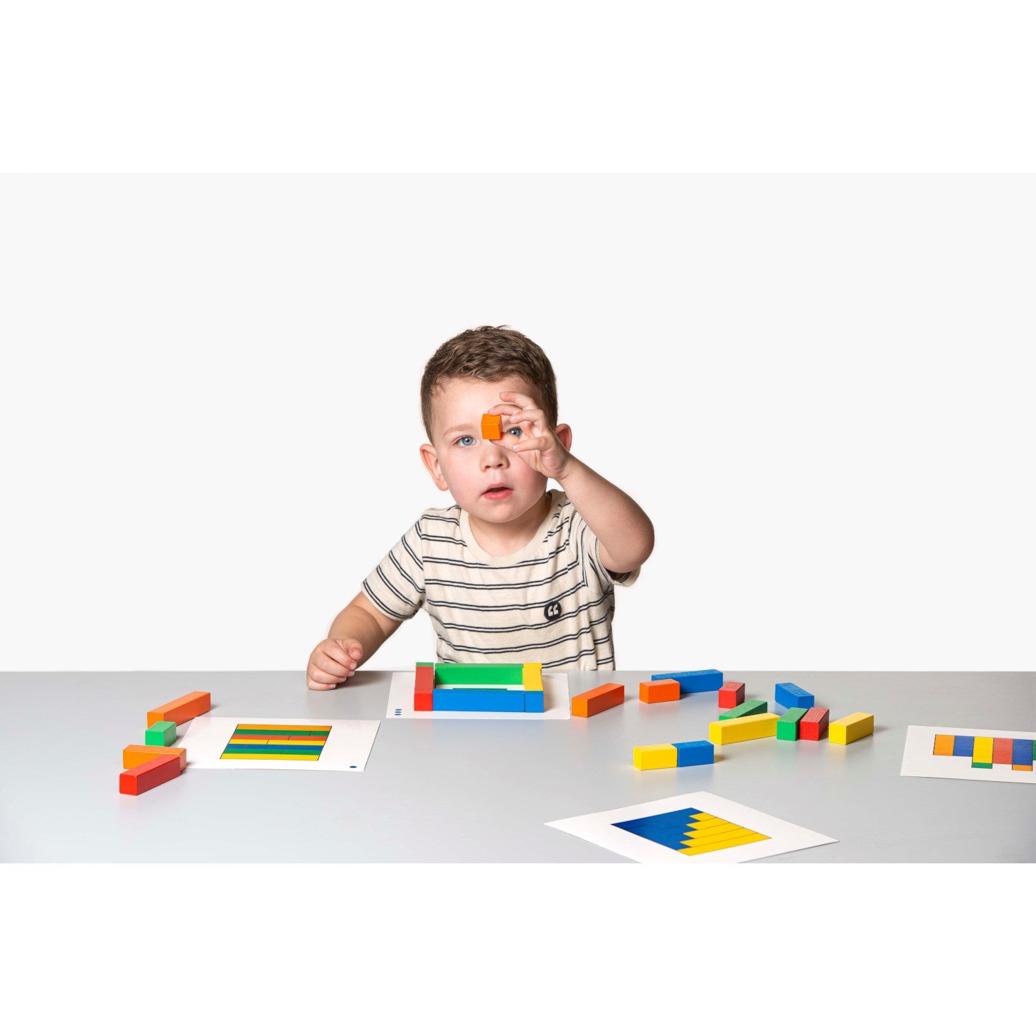 Place the wooden blocks on the assignment cards. For the exercises with only outlines the child can choose which colours and lengths to use.