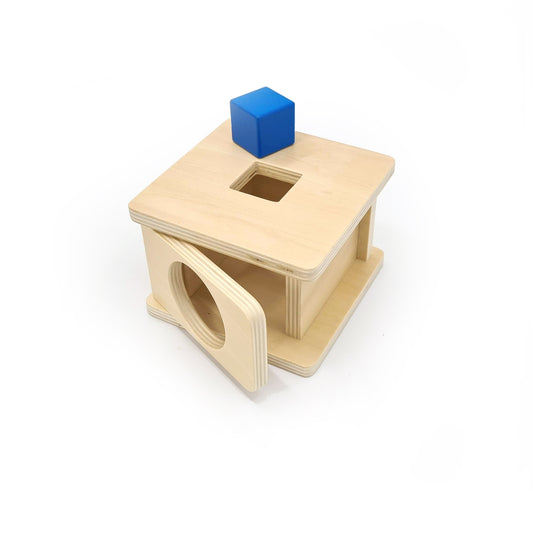 A wooden box with 7 removable lids and 4 shapes: cylinder, cube, rectangular and triangular prisms. The shape is retrieved from the drawer at the front.