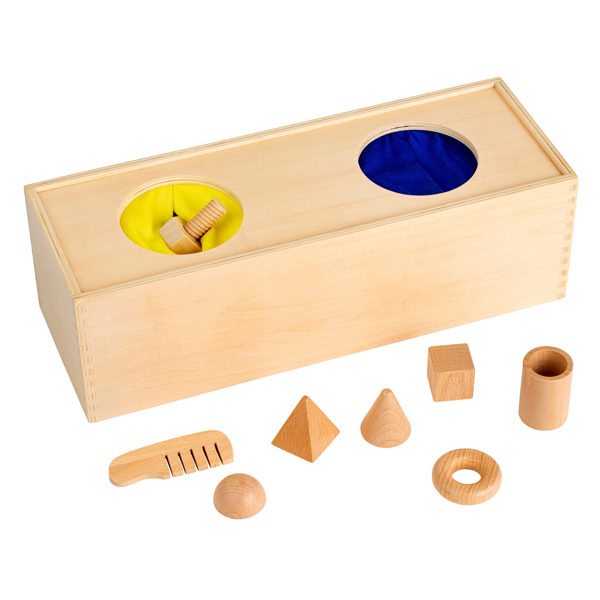 Identify objects by touch and develop the tactile sense. Expand the vocabulary by naming what’s in the box.