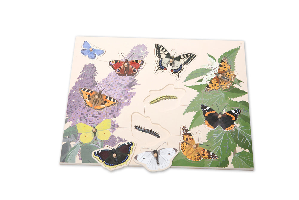 An English handmade cut tray knobbed board puzzle with 10 butterflies with their caterpillars hidden underneath: