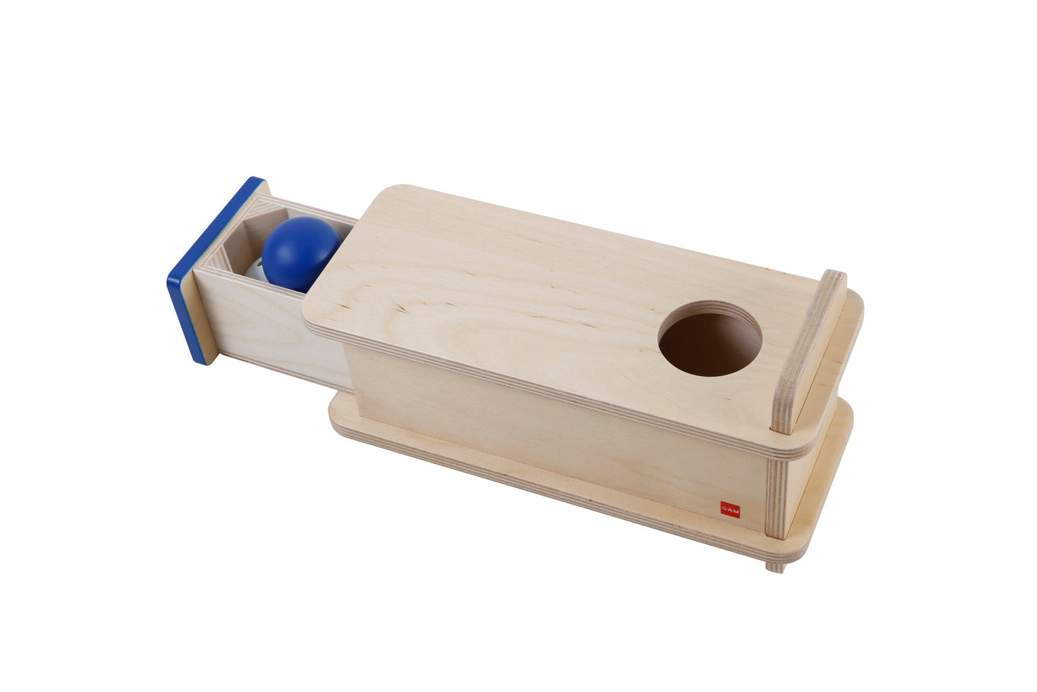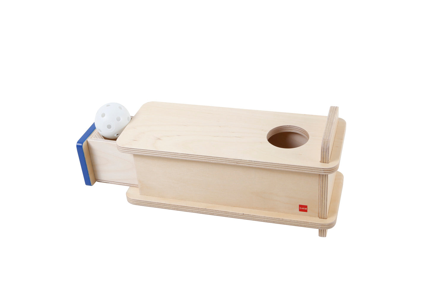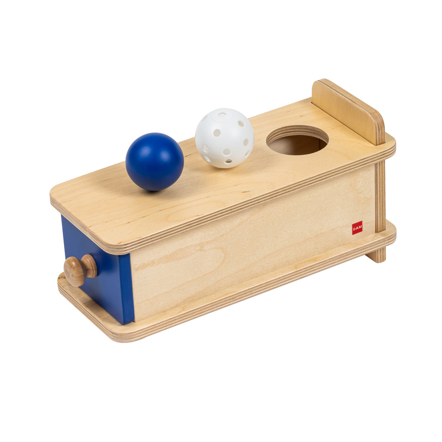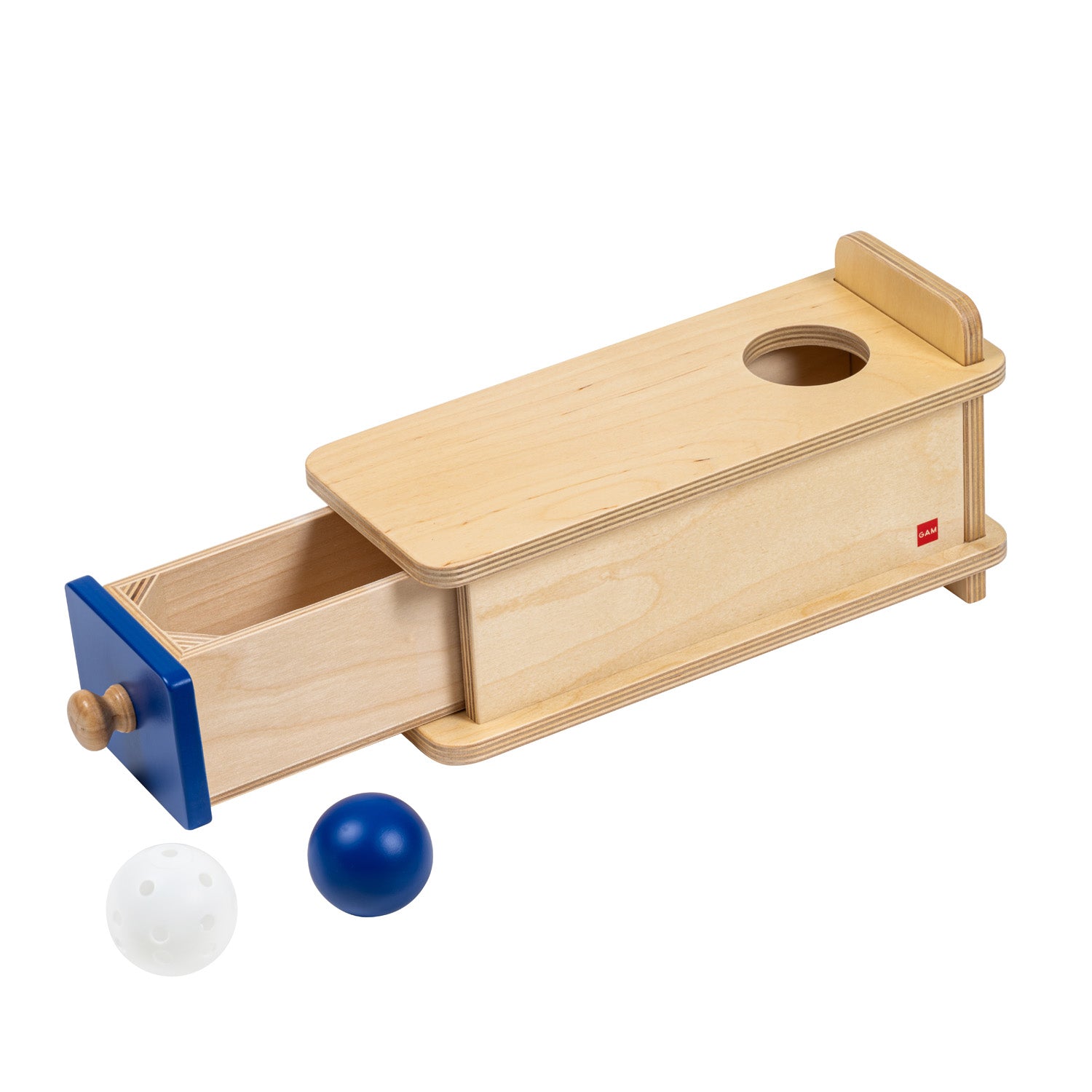 A box to practice hand-eye coordination and become familiar with object permanence. The child inserts the ball in the round hole and then it appears in the drawer.