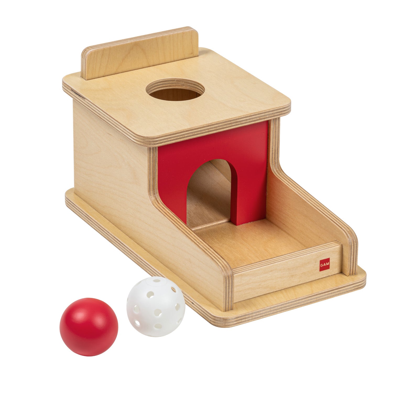A box to practice hand-eye coordination and become familiar with object permanence. The child inserts the ball in the round hole and then it appears in the tray.