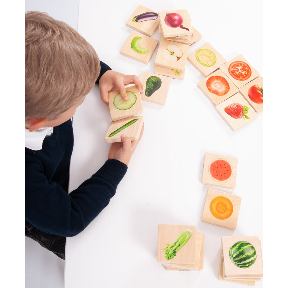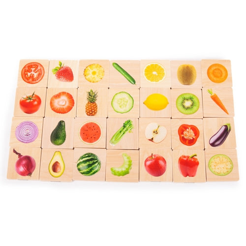 14 pairs of smooth and tactile beech plywood square tiles, each colour printed on one side with beautiful clear photographic images of real fruit and vegetables. The chunky tiles are easy for small hands to grip, rotate and turn over.