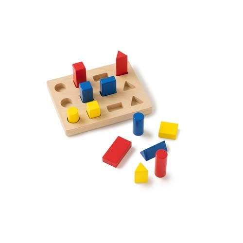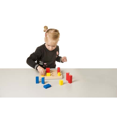 Triez les blocs par taille et par couleur en les plaçant au bon endroit sur le montant. Développer l’orientation spatiale et la motricité fine.