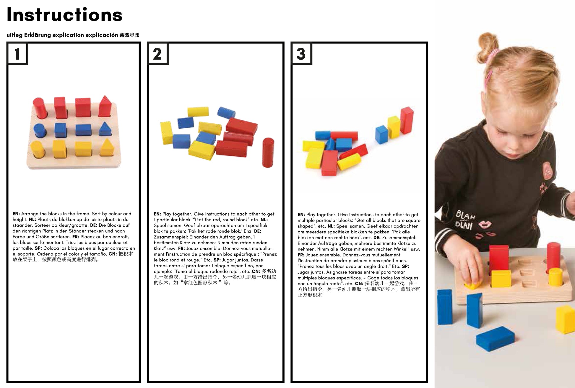Use the blocks to experiment with various colours and sizes. Position the blocks in the frame to develop spatial reasoning and fine motor skills.