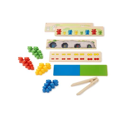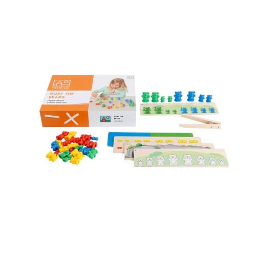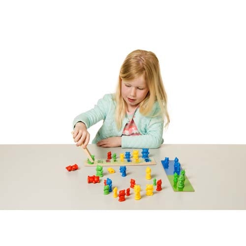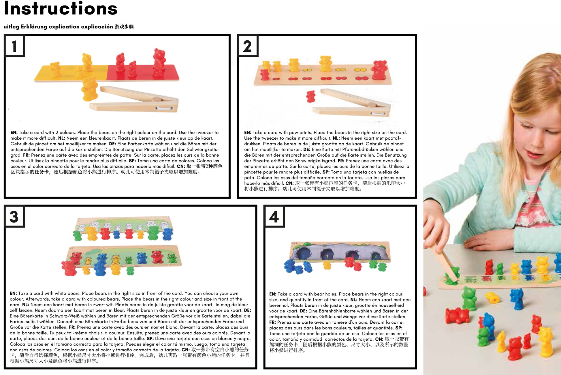 Place the bears with the same colour and size in front of the assignment card. Use the tweezer to develop fine motor skills.