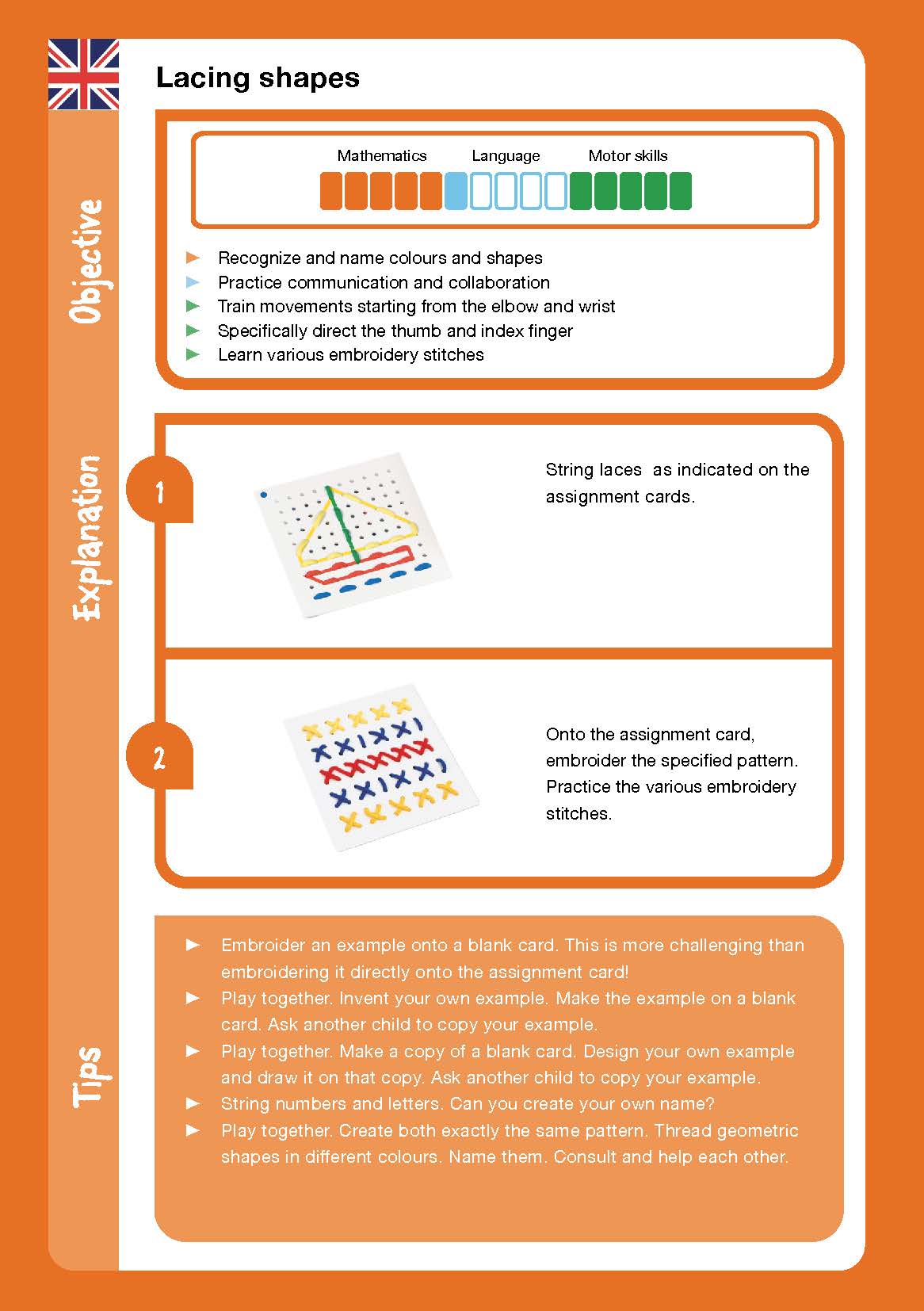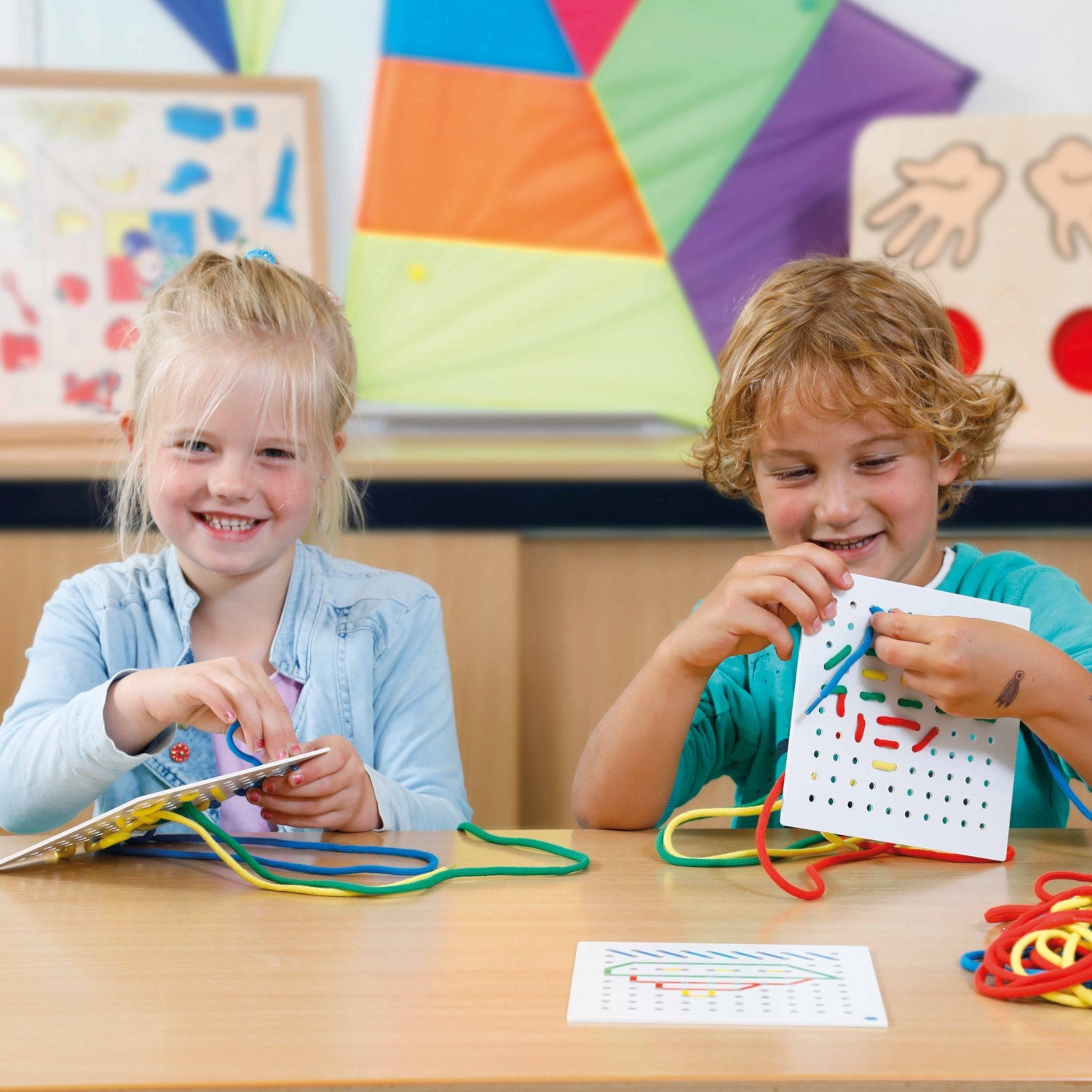 Vetrovorm threading game. A fun game for developing hand-eye coordination. Copy colourful designs by threading strings through the perforated cards or use the 6 blank cards to create own designs. Contents: 18 perforated plastic cards 24 cotton laces manual wooden box with partitions and lid (35 x 19 x 8 cm)