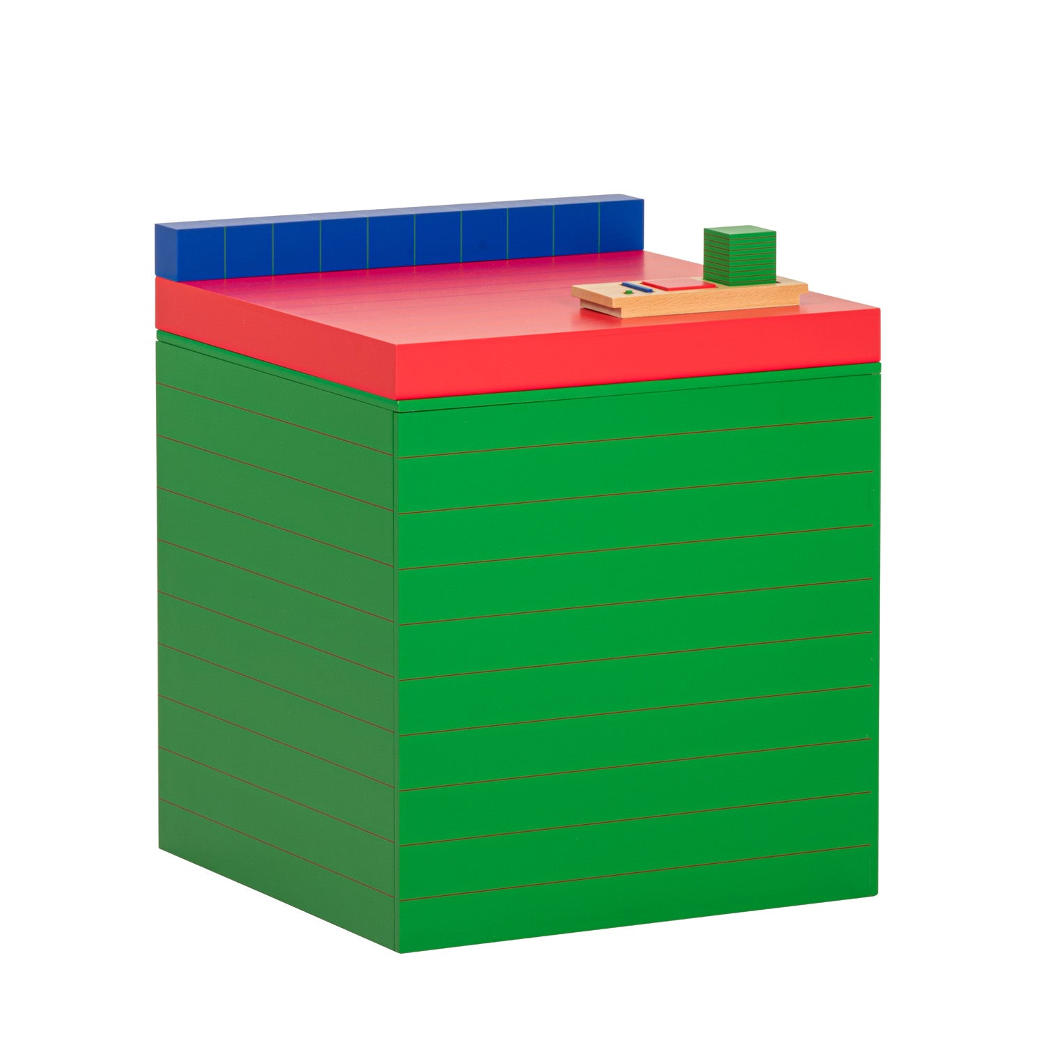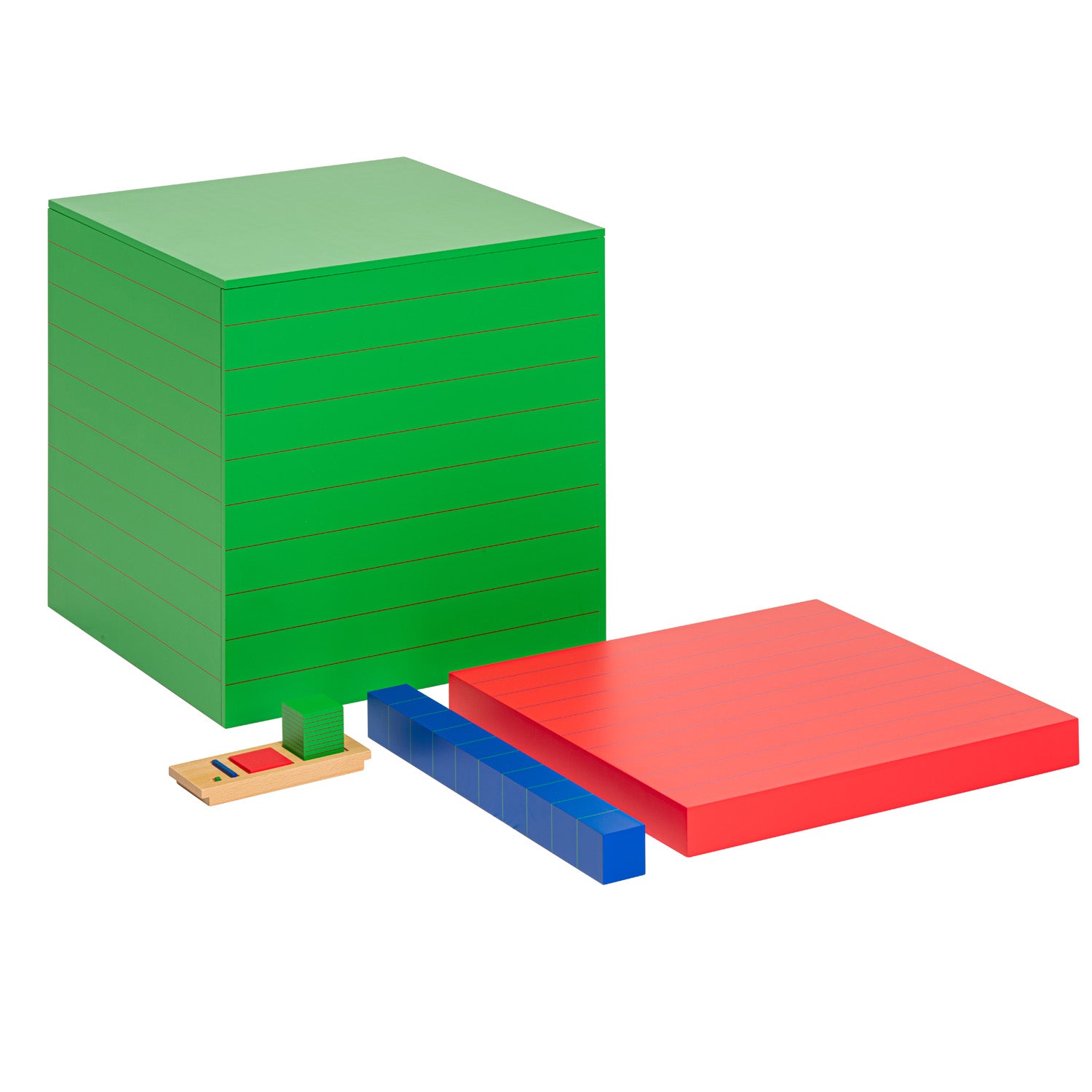 This material is used to represent in geometric form the hierarchy of number for: 1, 10, 100, 1000, 10,000, 100,000 and 1,000,000. The precise nature of these materials makes it possible to compare by size the decimal categories, visualize through the color-coded system the concept of decimal value and the families of number.