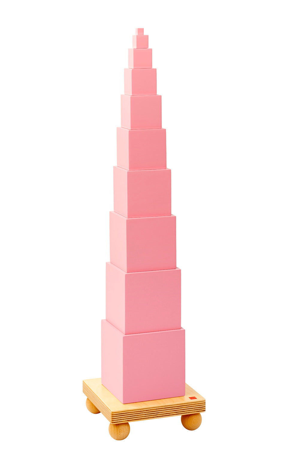 This series of cubes develops visual discrimination of size in three dimensions. Exploration with this material prepares the child for mathematical concepts in the decimal system, geometry and volume. The Pink Tower consists of ten wooden cubes painted pink and graduated in increments from 1 cm3 (small) to 1000 cm3 (large).