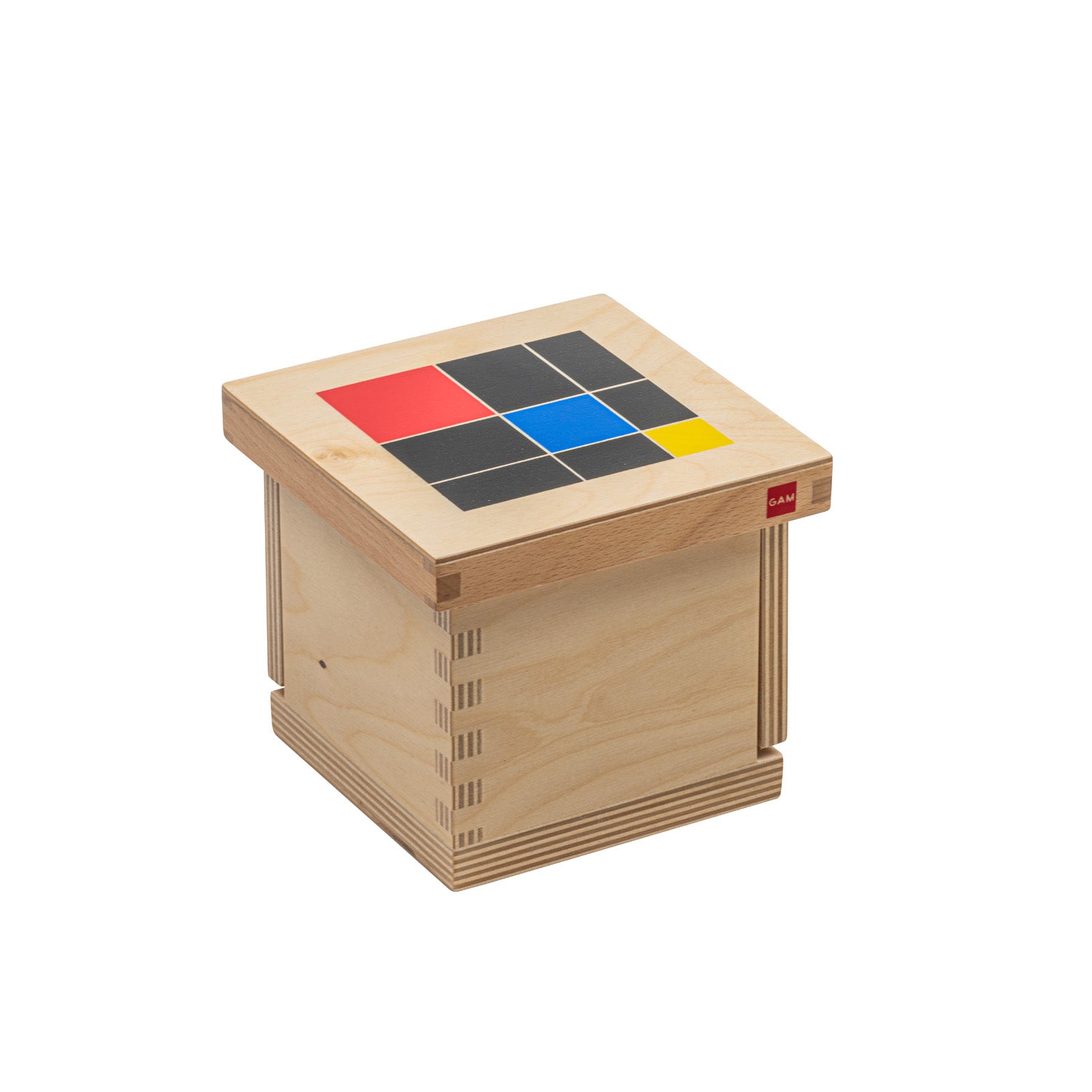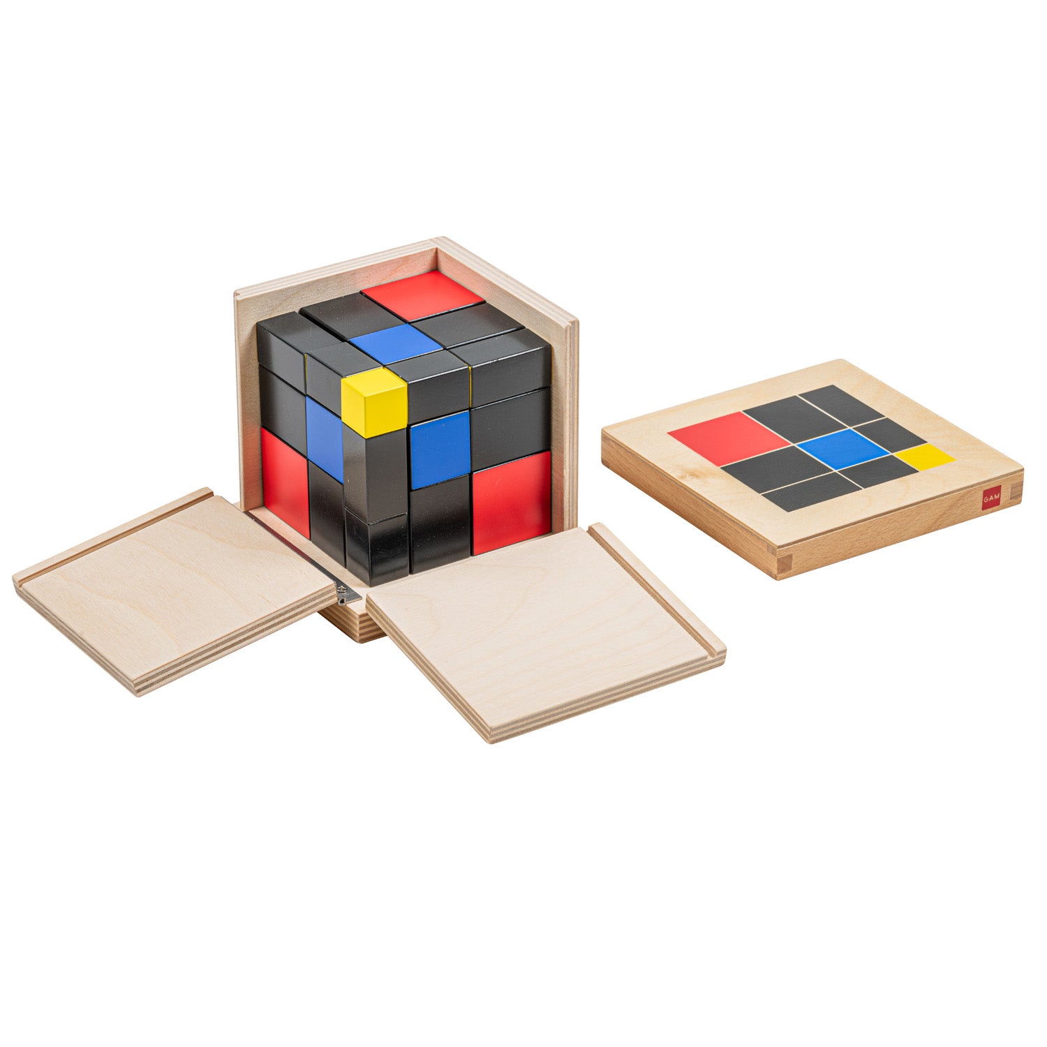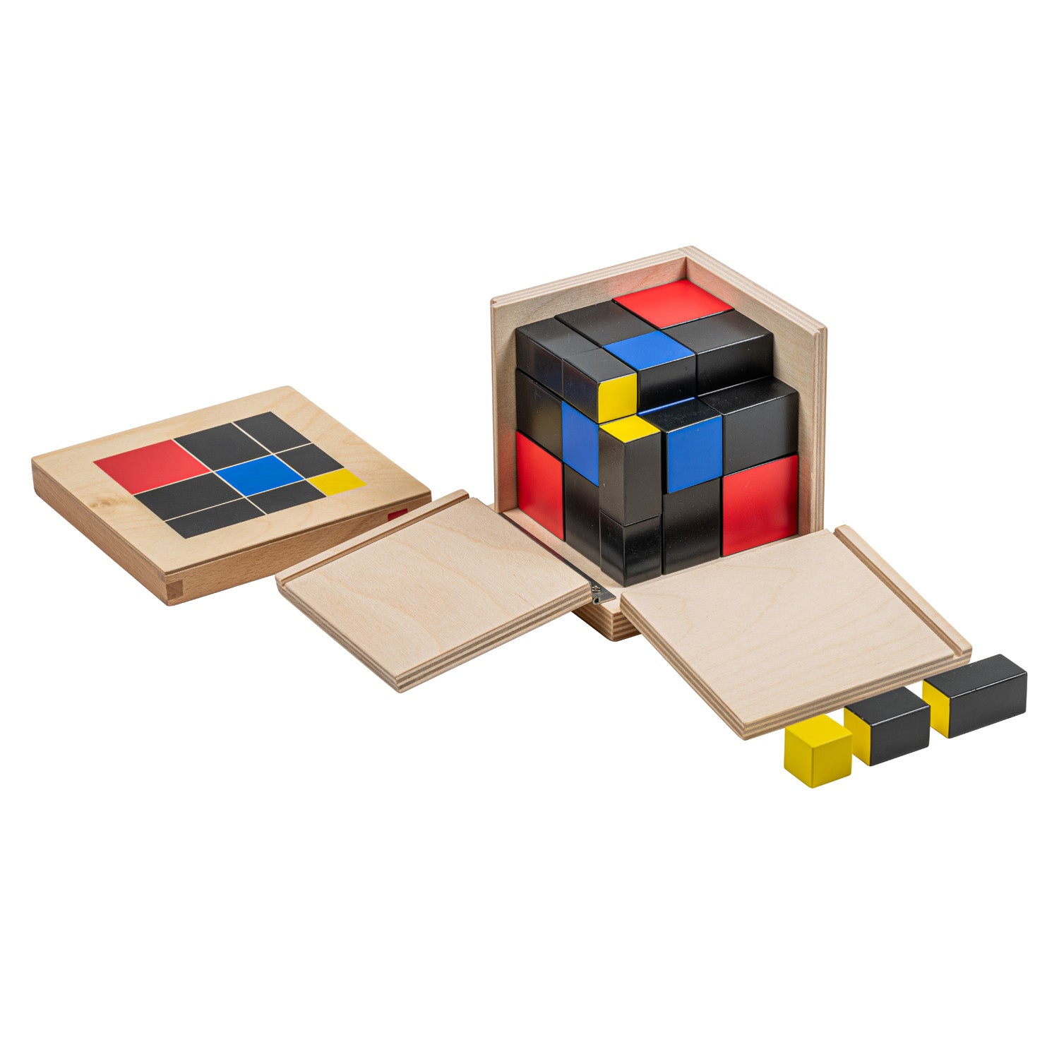 The Trinomial Cube is a concrete representation of the algebraic formula (a + b + c)³. The factors of the equation are represented by cubes and prisms. The elementary Montessori child uses the Trinomial Cube as an activity of algebraic exploration. Contained in a hinged wooden box with lid.
