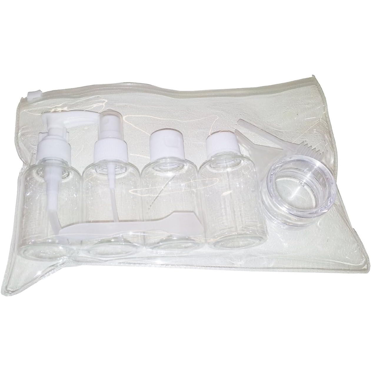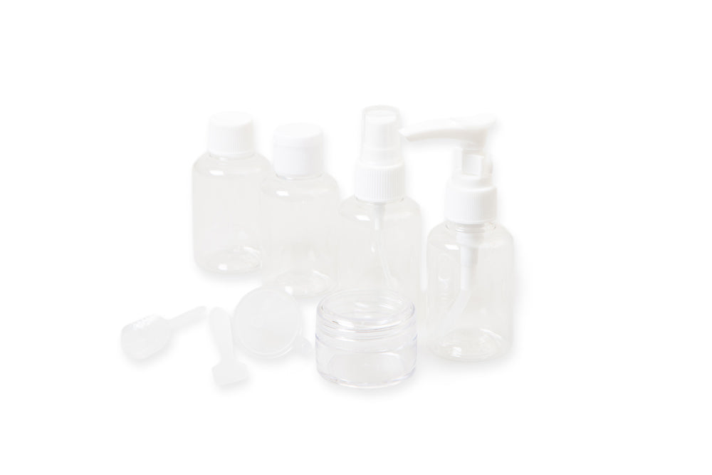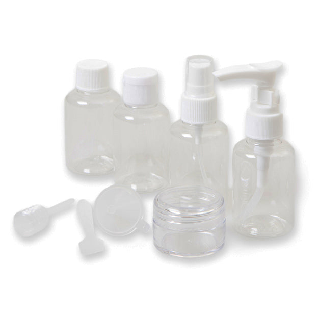 A set of 4 clear bottles, one screw top 30ml jar, a minature funnel, pipette and spatula in a clear ziplock case.