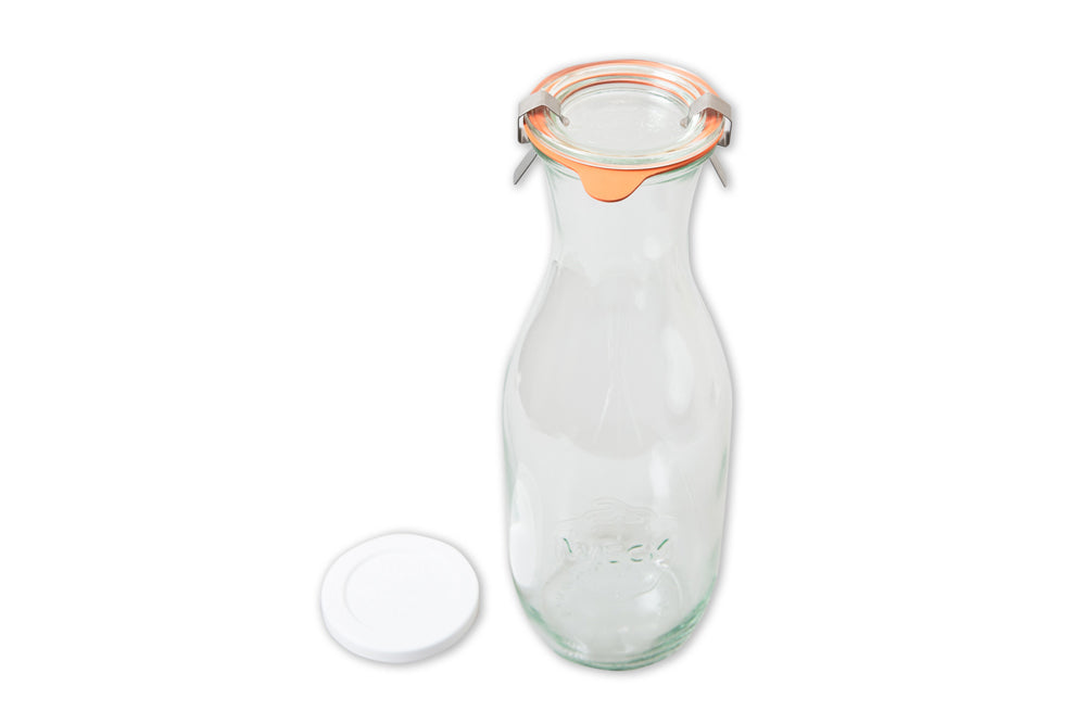 A wide necked thick-glass bottle with a glass or plastic lid (both supplied).