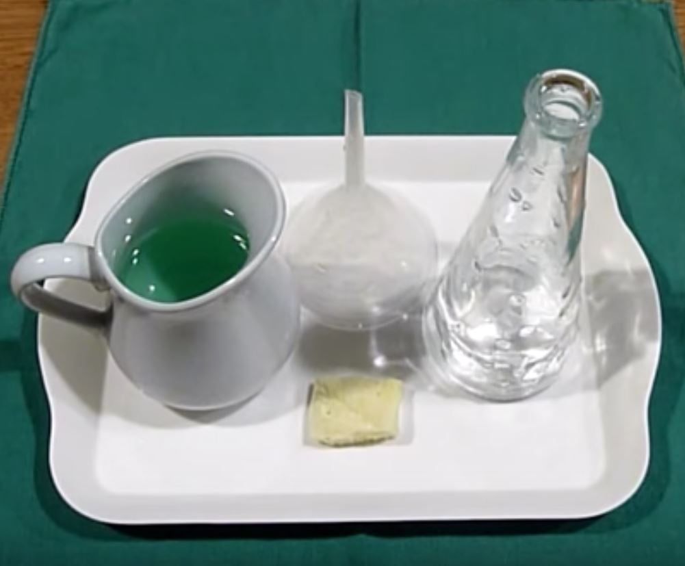 Large jug of (coloured) water, funnel, carafe, small sponge for drips, tray