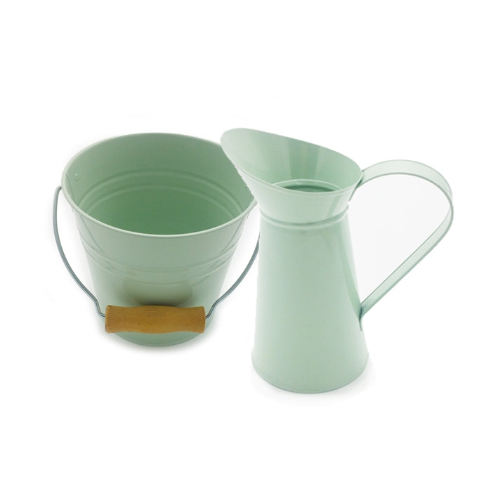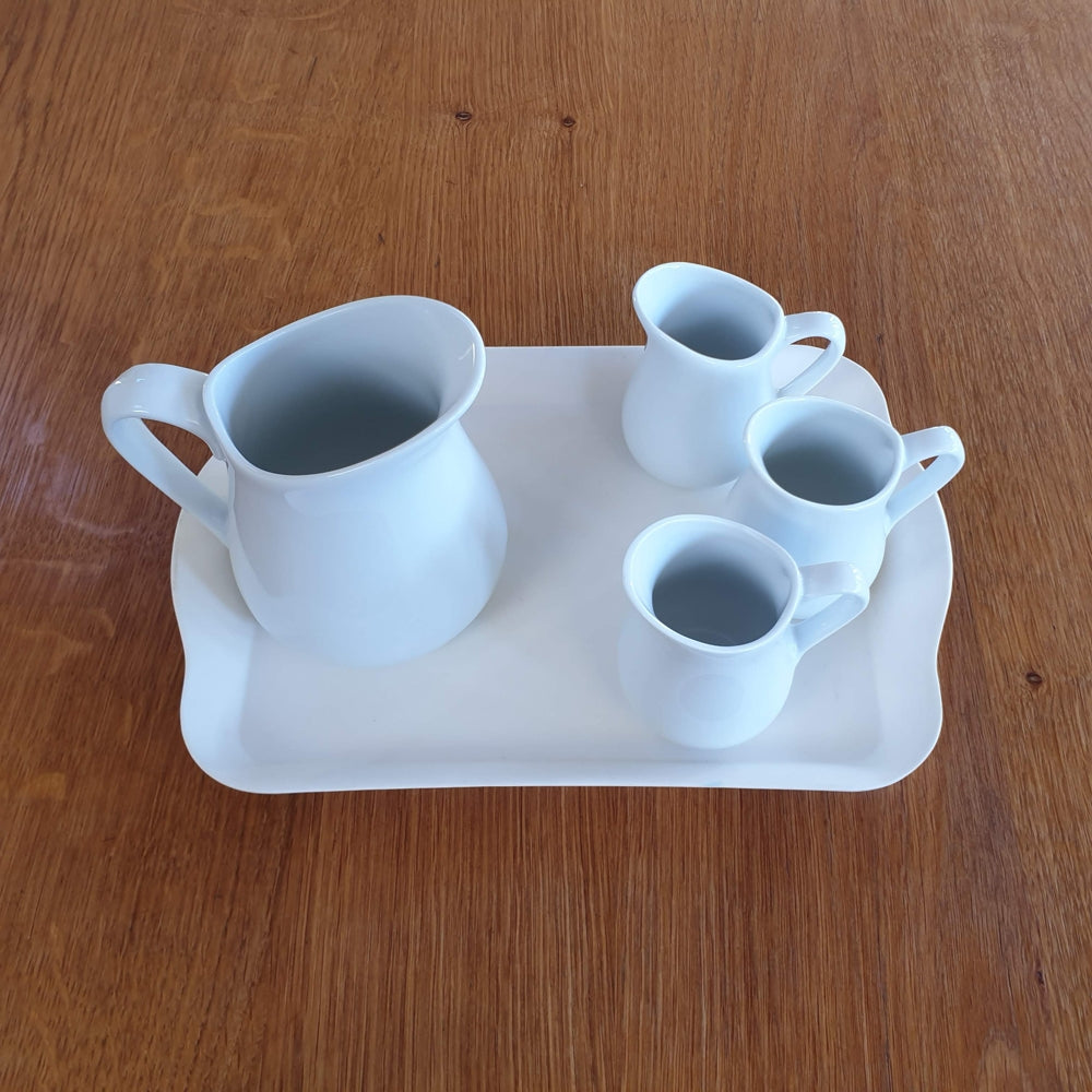 3 mini jugs and one large jug (containing lentils or water), small sponge for drips, tray