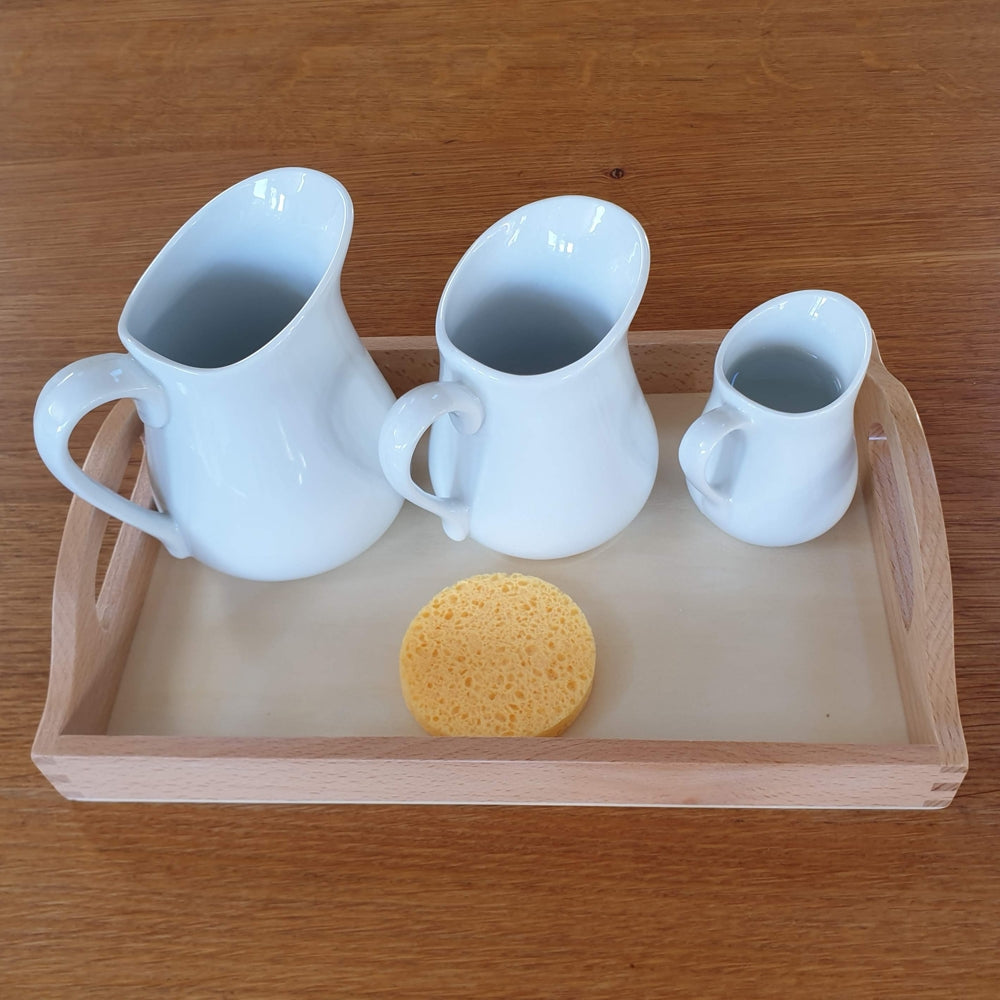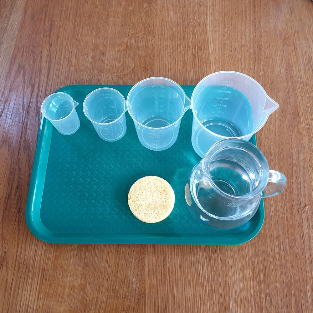 3 or more different measuring jugs or beakers, small sponge for drips, tray