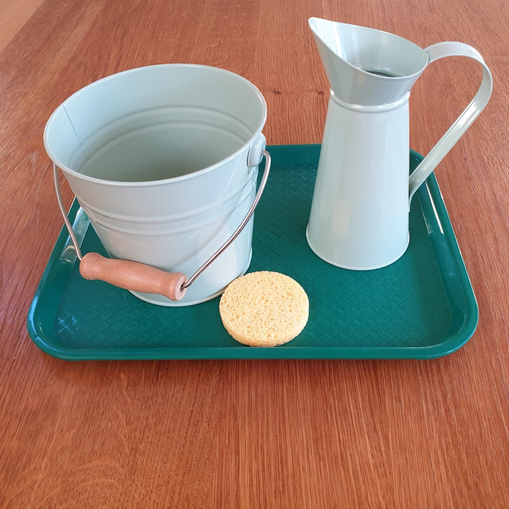 glass jug, carafe with a coloured elastic band around it, small sponge for drips, tray