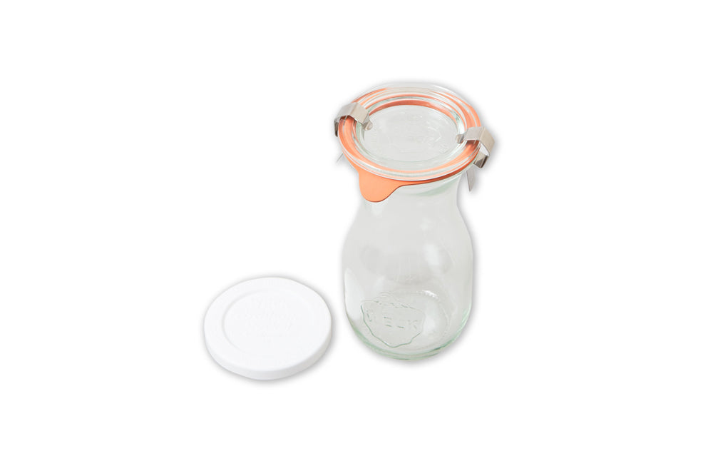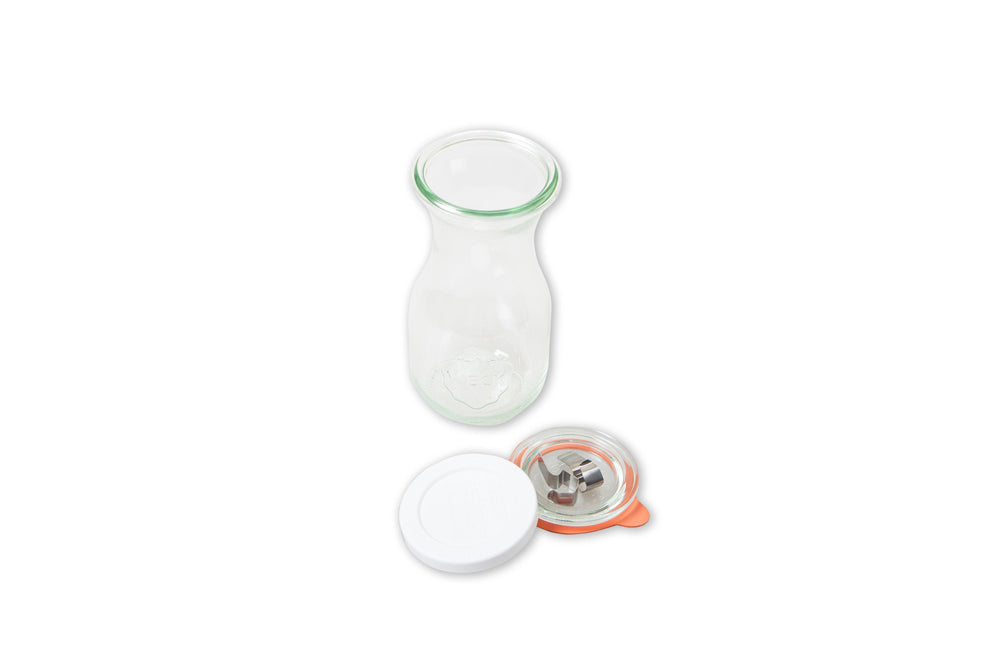 A wide necked thick-glass bottle with a glass or plastic lid (both supplied).
