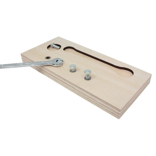 The child can practice the action of using a spanner (wrench) by removing and re-inserting four bolts. The set consists of a wooden block with four bolts which screw into permanently fixed, threaded nuts. The board also has two insets: one for the spanner and one for holding the bolts once they've been removed. The spanner is made of a chrome-plated alloy and features both open and closed sockets for engaging the bolts.