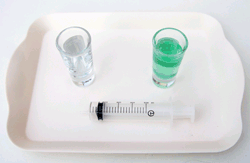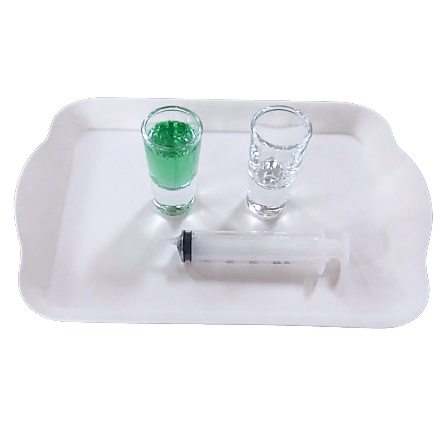 2 shot glasses, syringe, tray