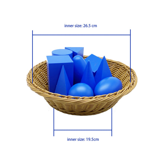 Wicker basket with a cloth cover to hold the Small Geometric Solids. A sturdy basket ideal for storing activities, especially taller items.