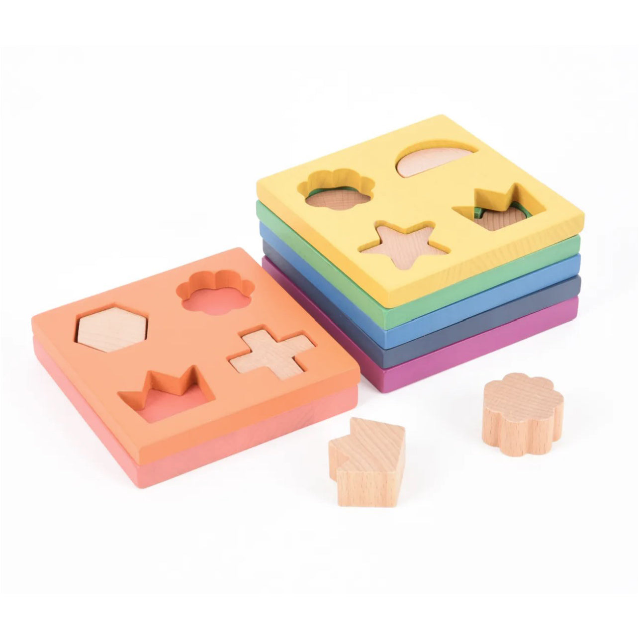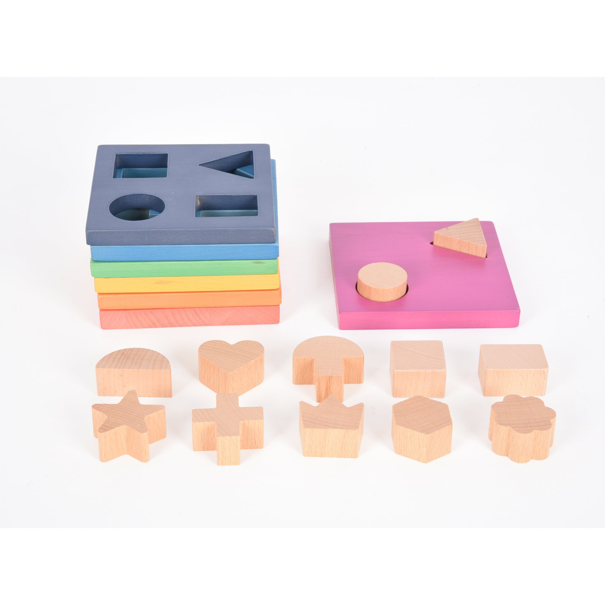 A beautiful beechwood 7-layer stacking puzzle, with 12 surprise shapes hidden inside. The smooth natural solid wooden shapes must be fitted correctly into their matching holes in each rainbow colour panel, then the panels can be layered to complete the stack. The set provides opportunities for developing logic and reasoning, problem-solving, collaborative play, fine motor skills, hand-eye coordination, colour recognition, shape recognition and shape matching.