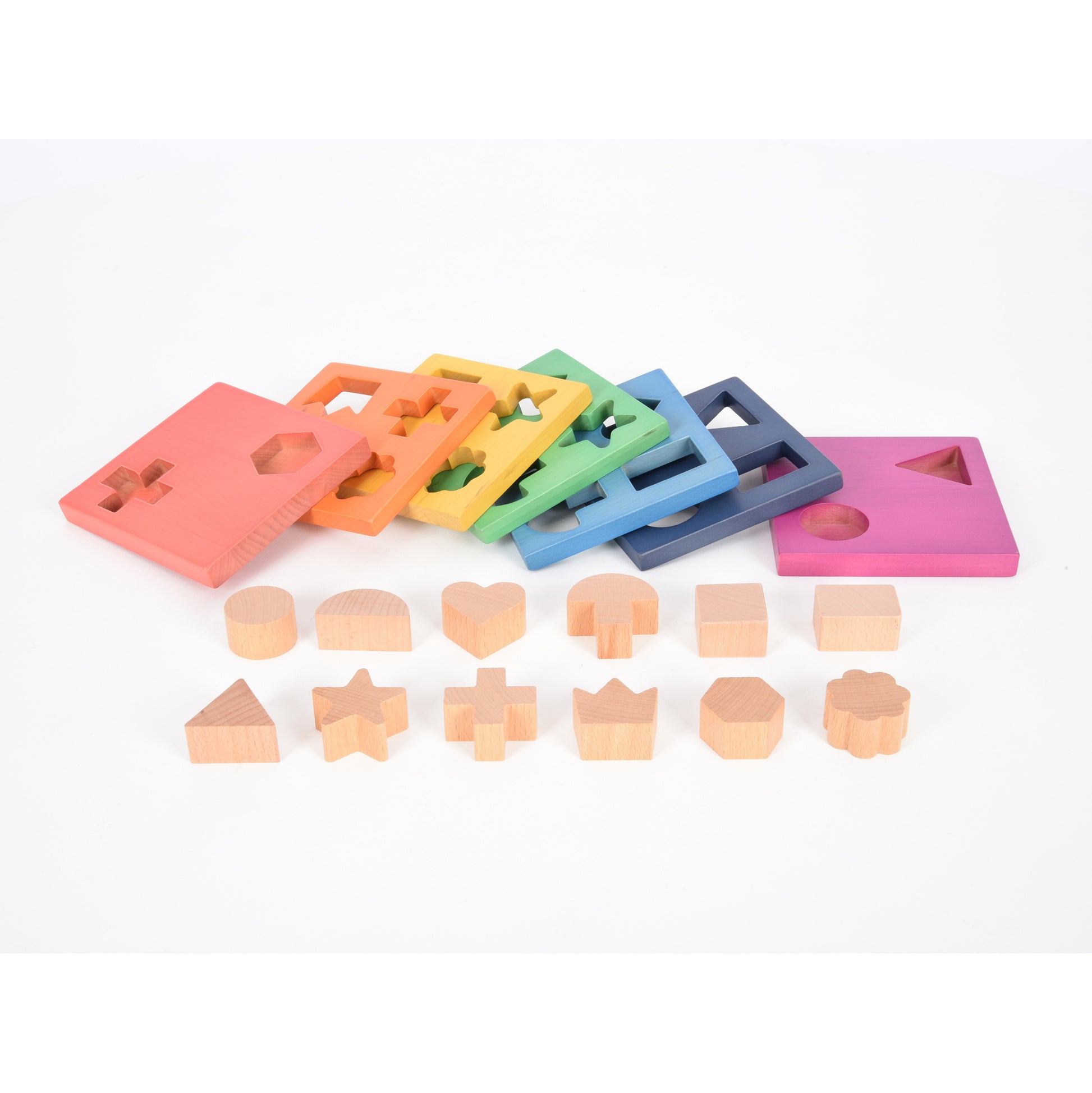 The smooth panels are in red, orange, yellow, green, blue, indigo and violet. The chunky tactile shapes inside are a cross, hexagon, crown, flower, semicircle, star, mushroom, heart, square, rectangle, circle and triangle.