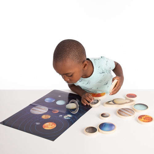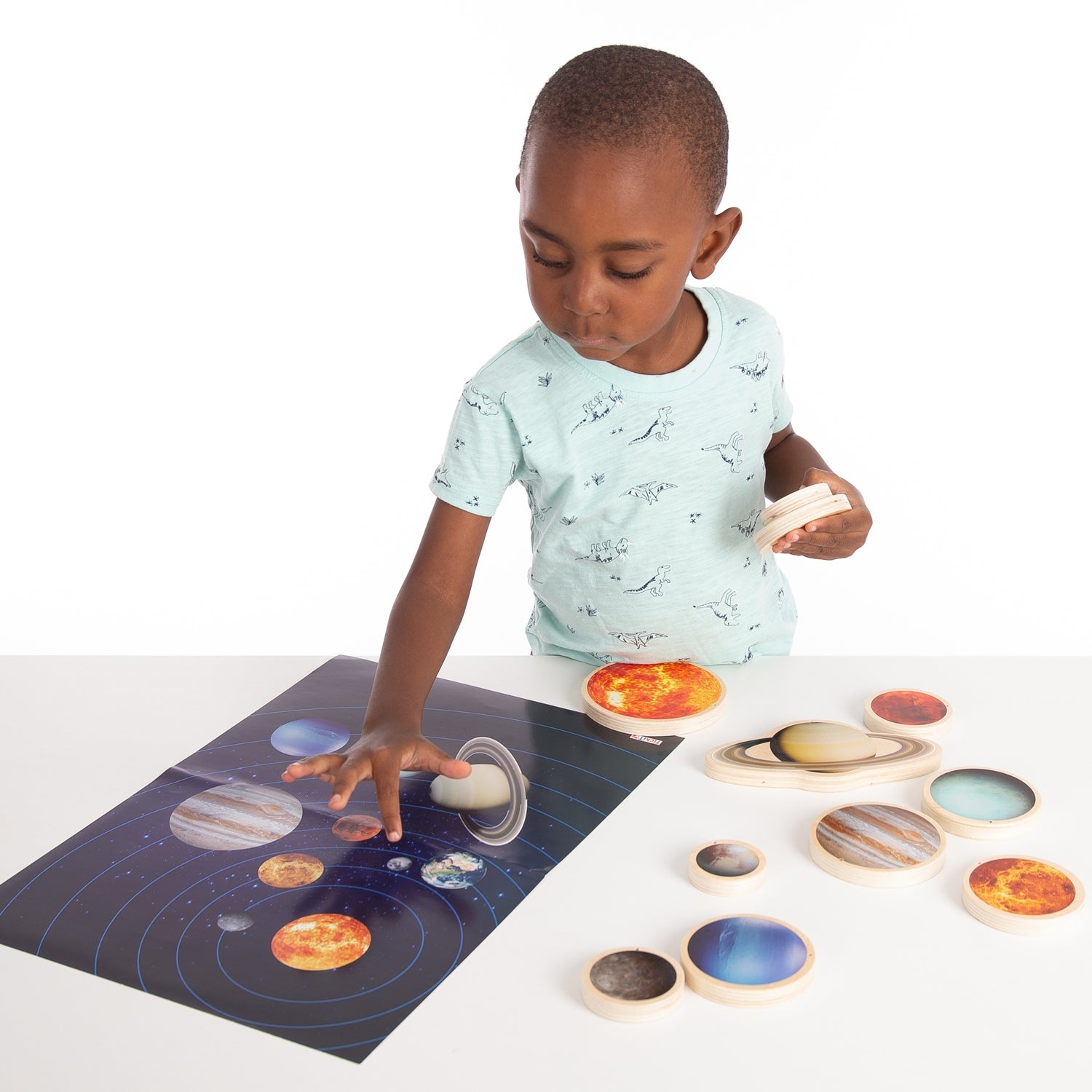 Children can learn about the planets in our solar system with these 11 wooden disks printed on one side with beautiful clear photo realistic illustrations of our sun, Mercury, Venus, Earth, our moon, Mars, Jupiter, Saturn, Uranus, Neptune and Pluto. The reverse is clearly printed with the name, diameter, average temperature and distance from the sun. The chunky discs are easy for children to hold, rotate, turn over and to stand upright.