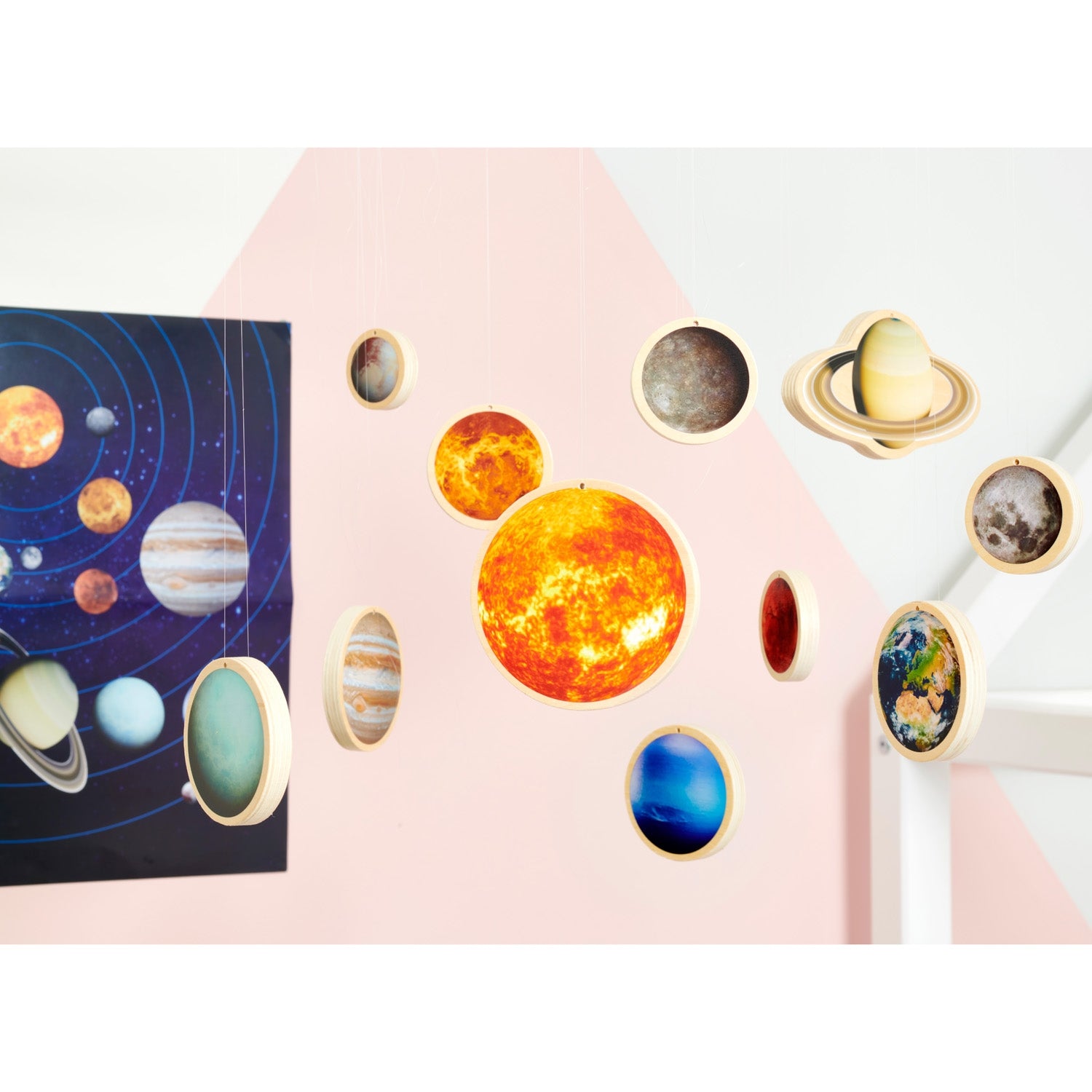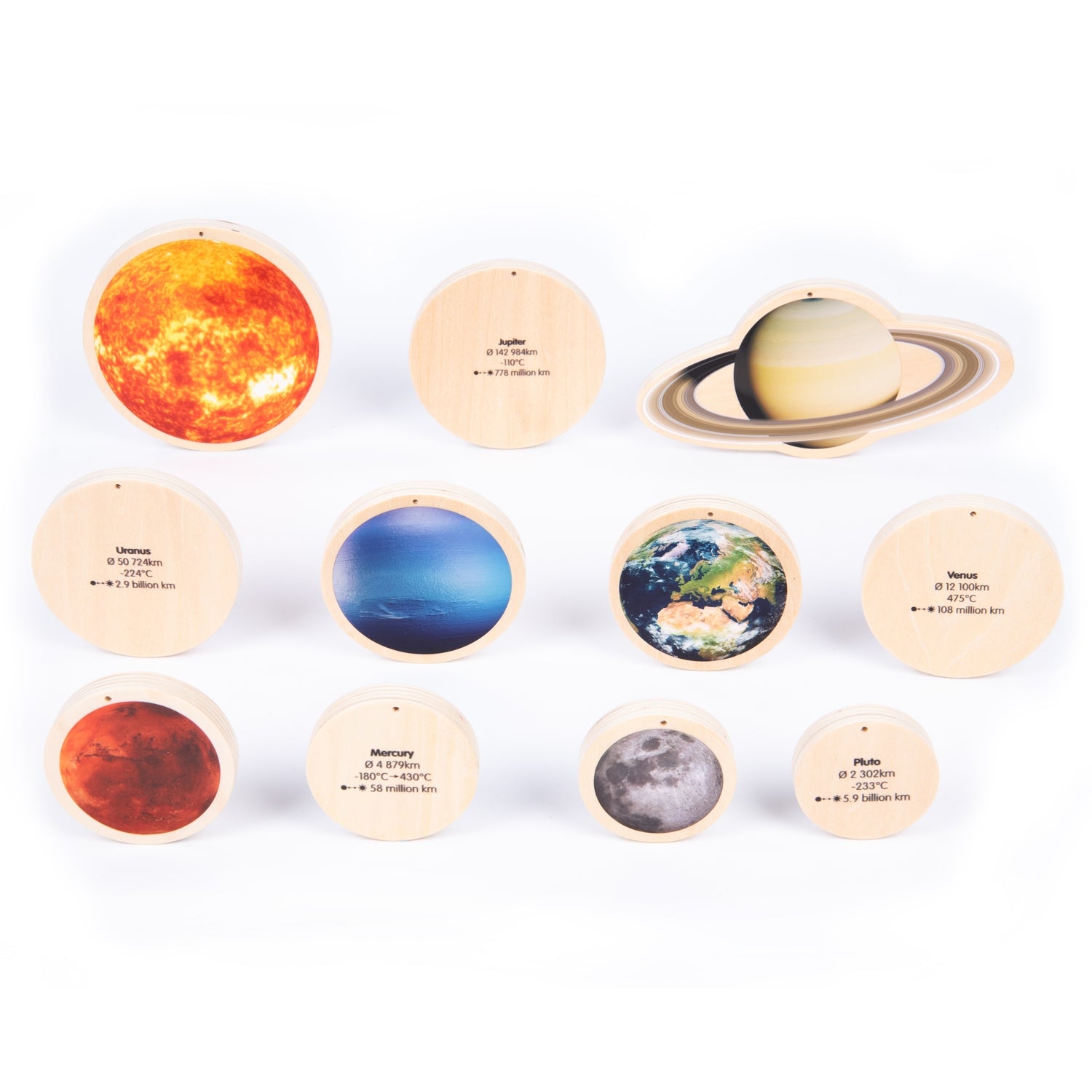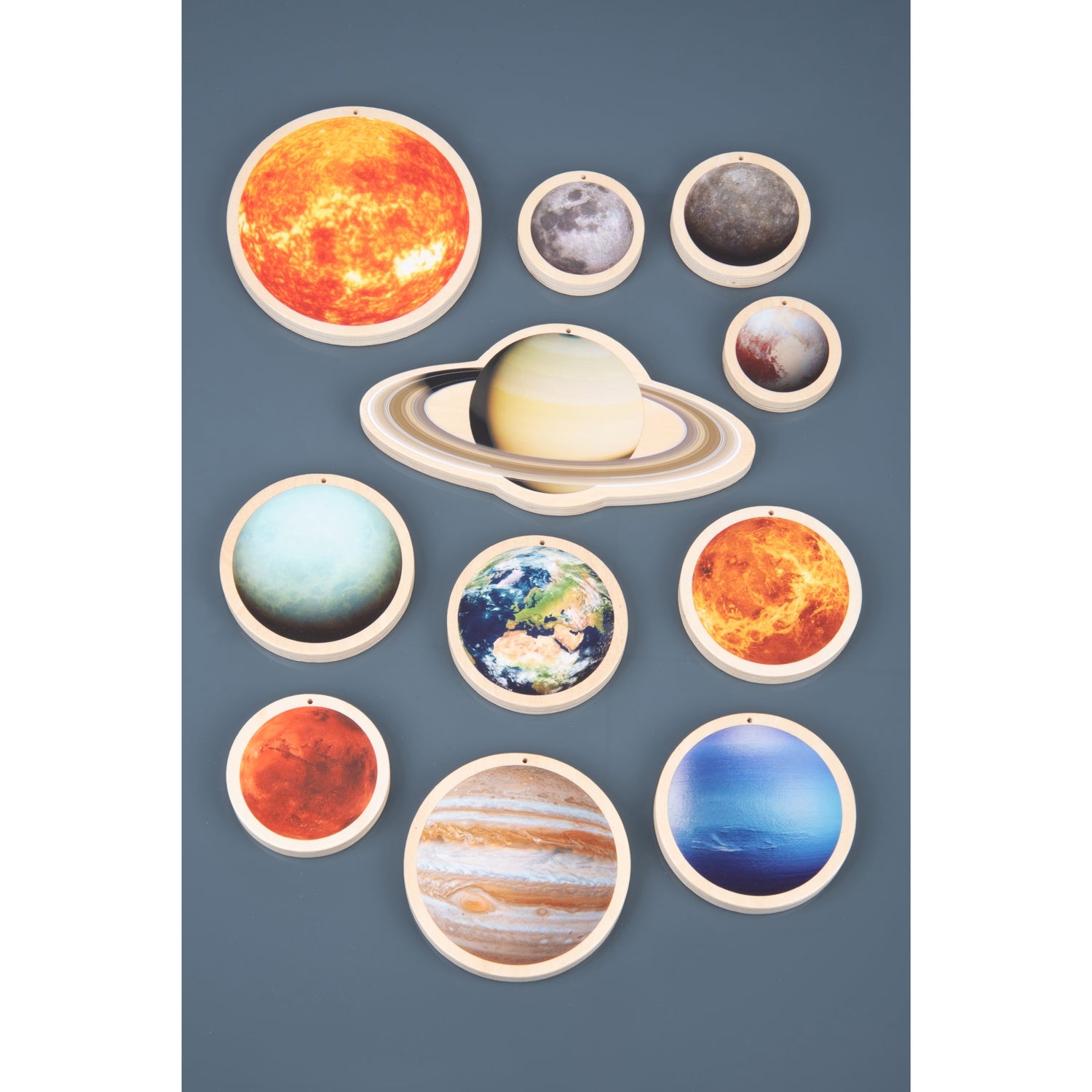 11 wooden disks printed on one side with beautiful clear photo realistic illustrations of our sun, Mercury, Venus, Earth, our moon, Mars, Jupiter, Saturn, Uranus, Neptune and Pluto. The reverse is clearly printed with the name, diameter, average temperature and distance from the sun. The chunky discs are easy for children to hold, rotate, turn over and to stand upright.