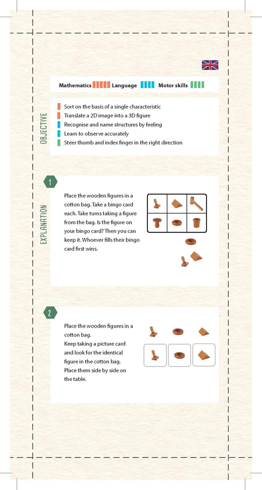 Through touch, the child pairs the fabrics according to varying textures. Includes: fabrics in cotton, wool, jute, silk, leather and synthetic material and a wooden box with two compartments.